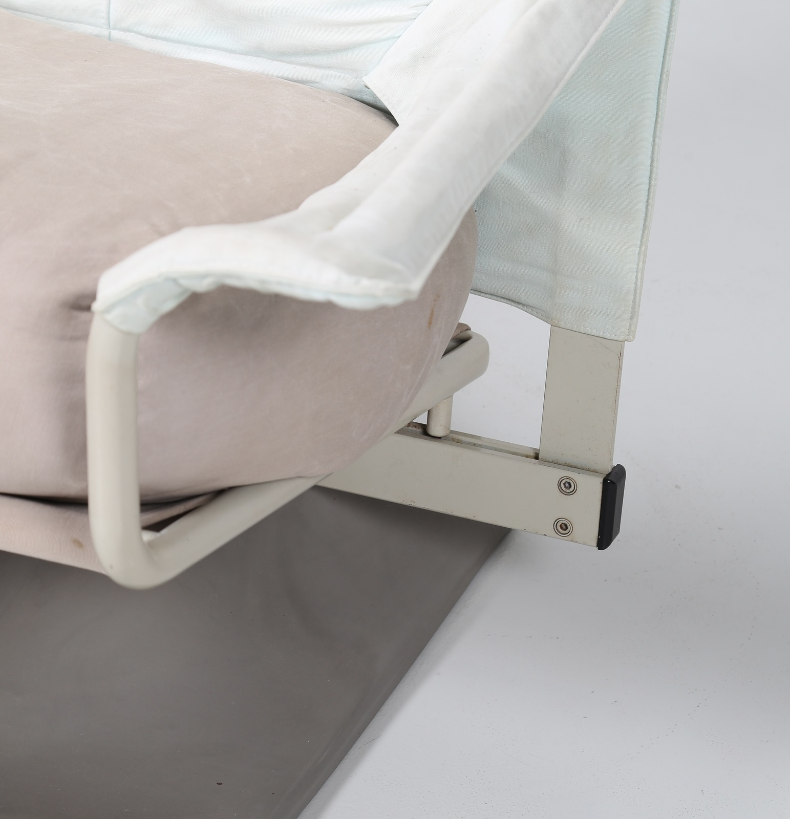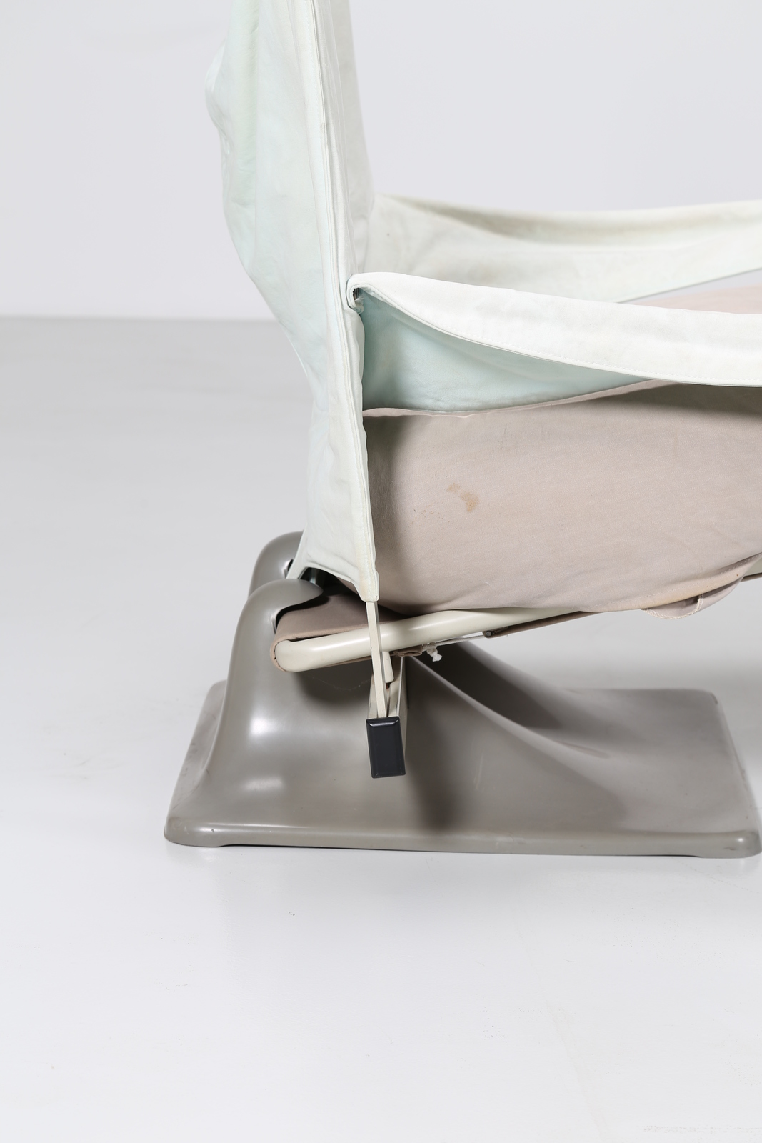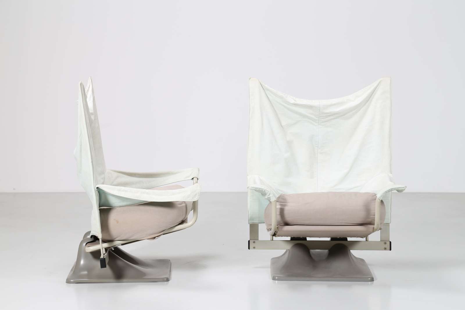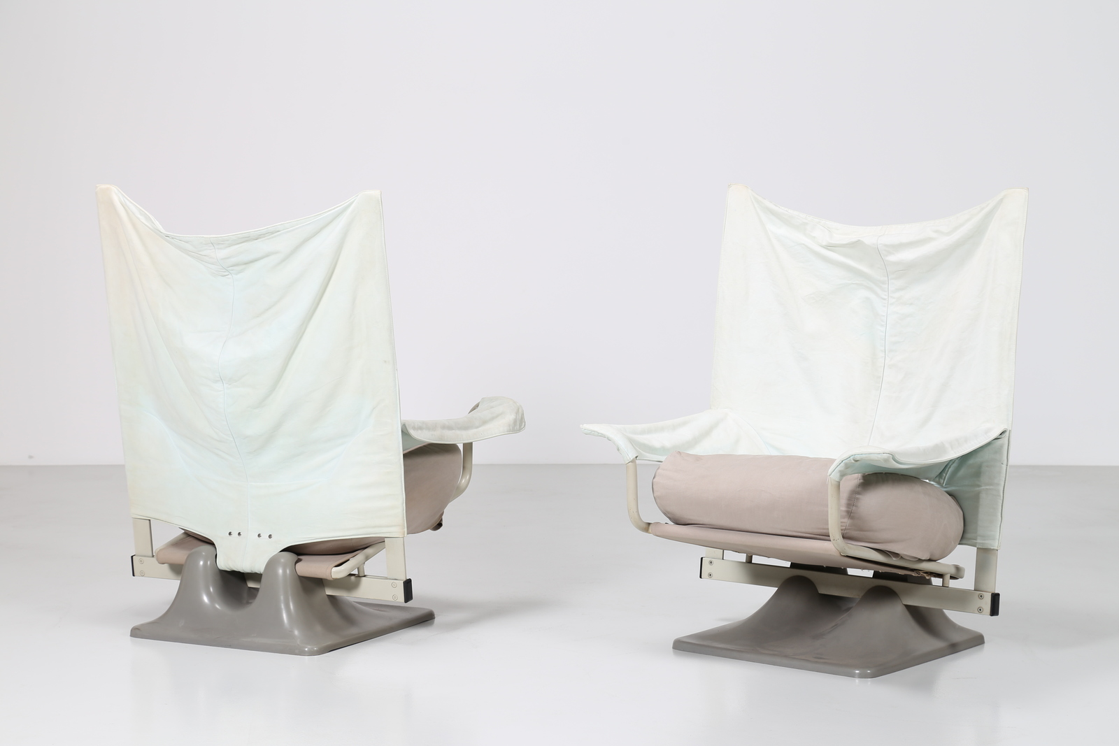 DEGANELLO PAOLO (n. 1940) Coppia di poltrone con struttura in acciaio verniciato, base in materiale plastico, rivestimento in tessuto, mod. 650 AEO, per Cassina anni 70