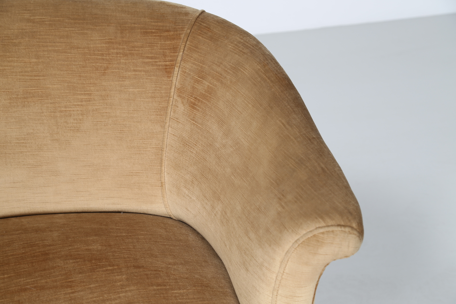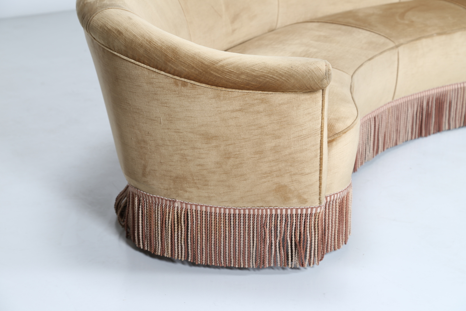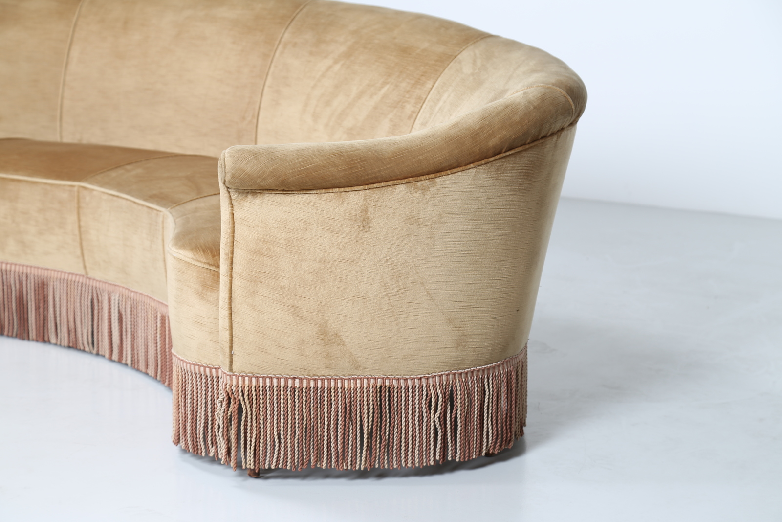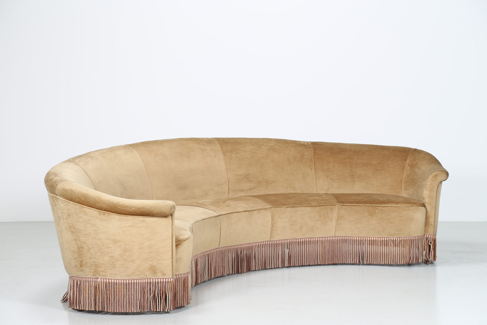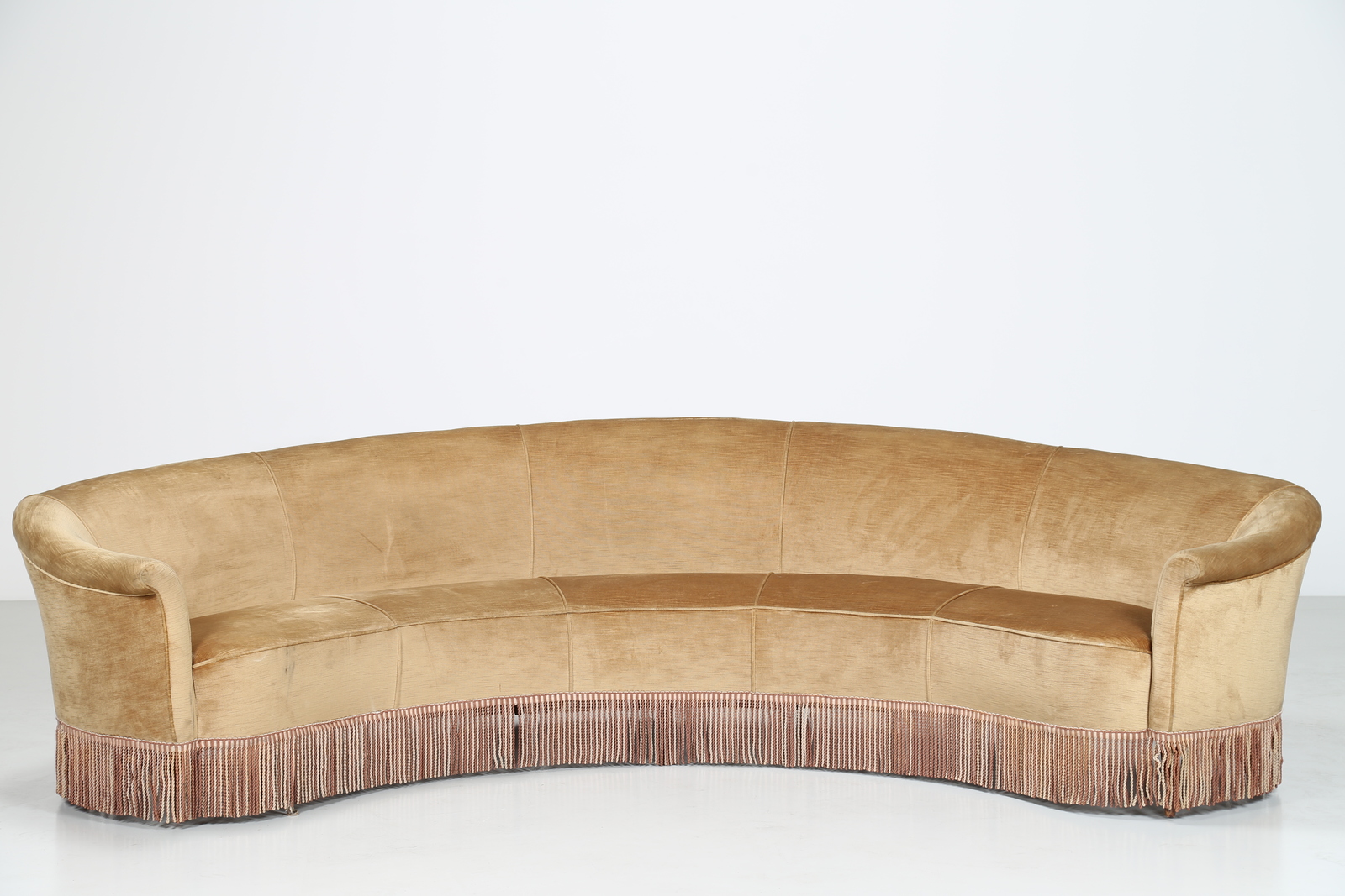 MANIFATTURA ITALIANA Divano curvo in legno e tessuto, anni 50. -. Cm 310,00 x 60,00 x 150,00.