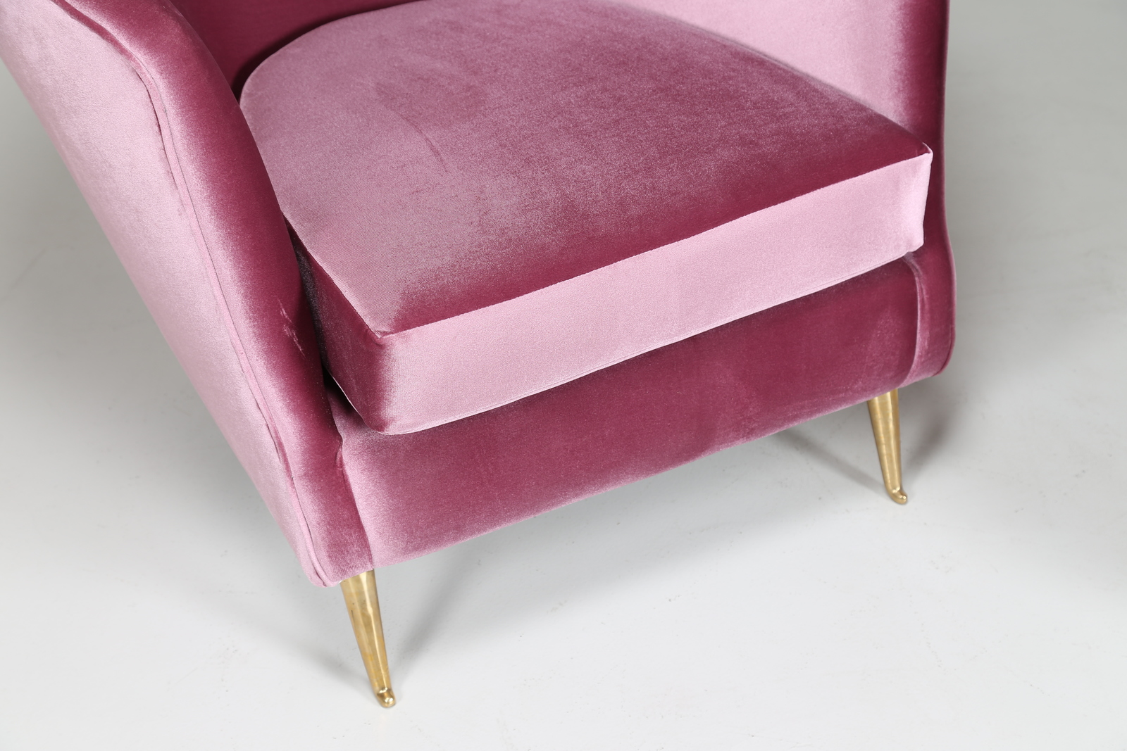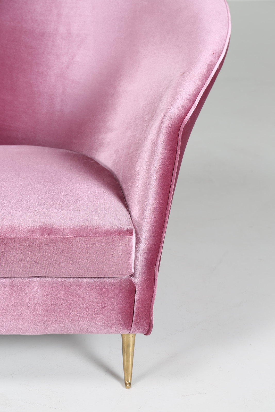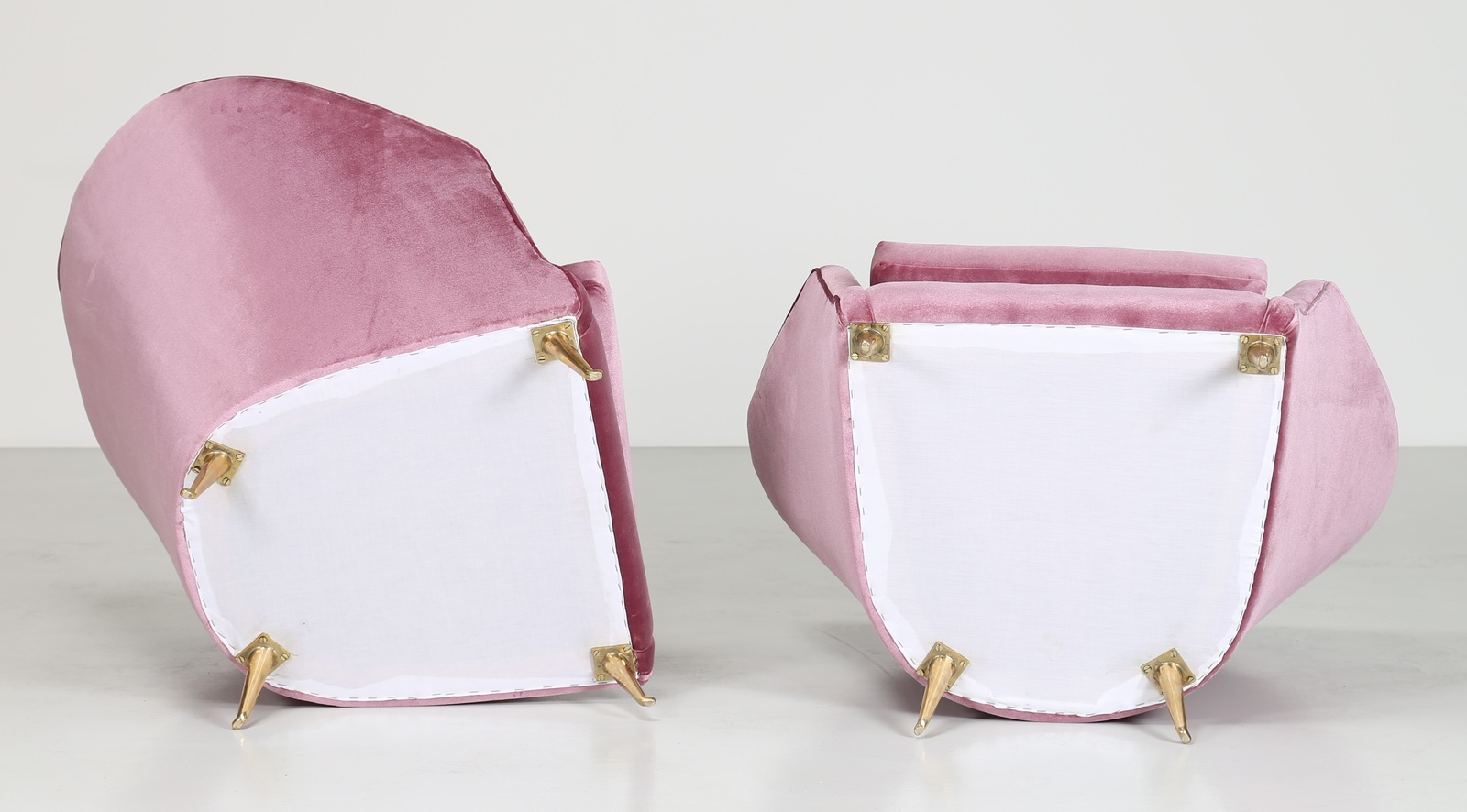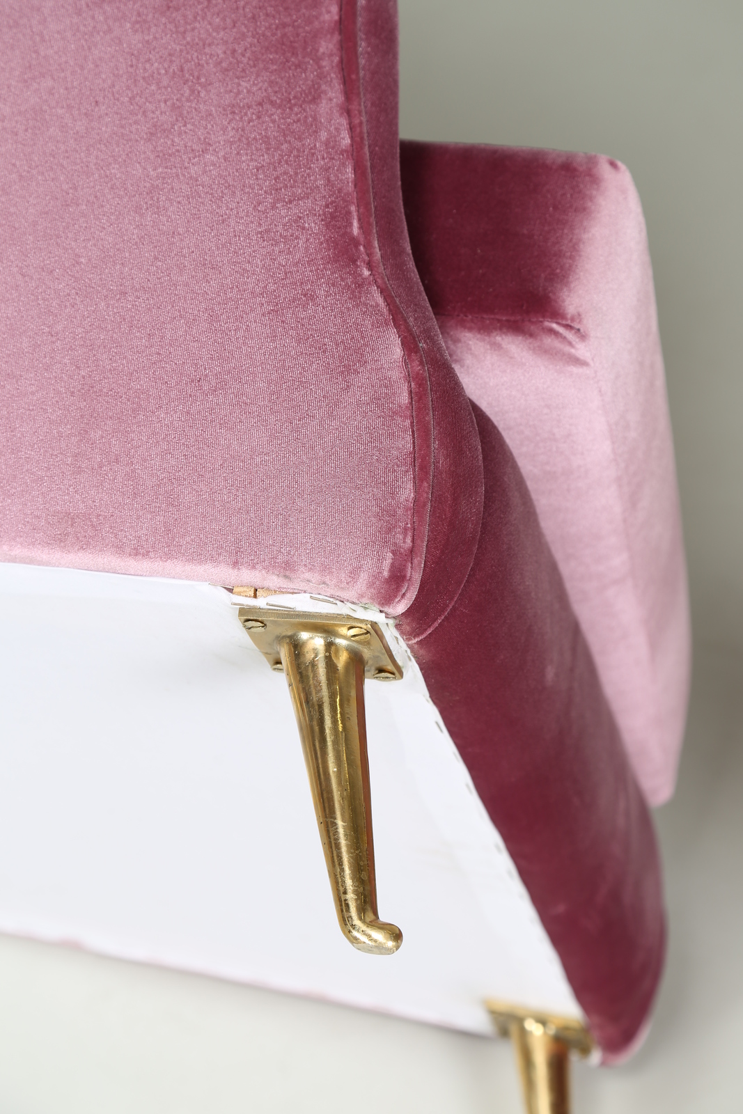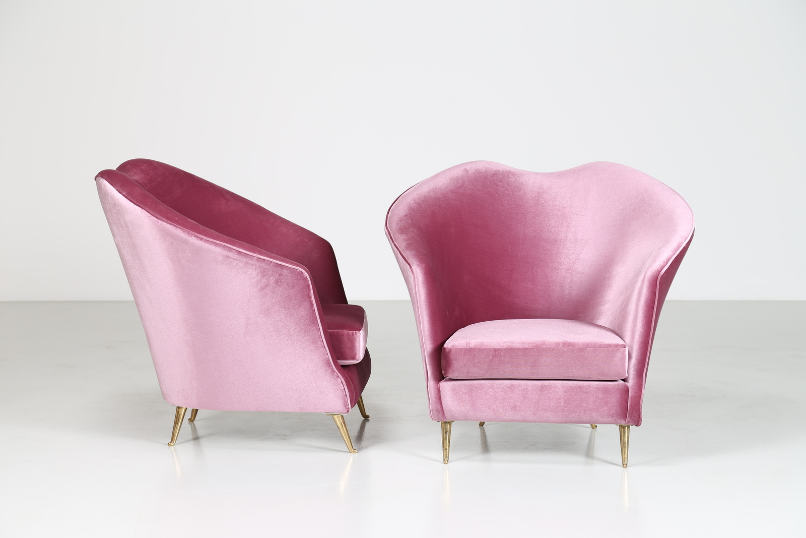 LACCA CESARE Attrib. Coppia di poltrone in legno con piedini in ottone e tessuto, anni 50