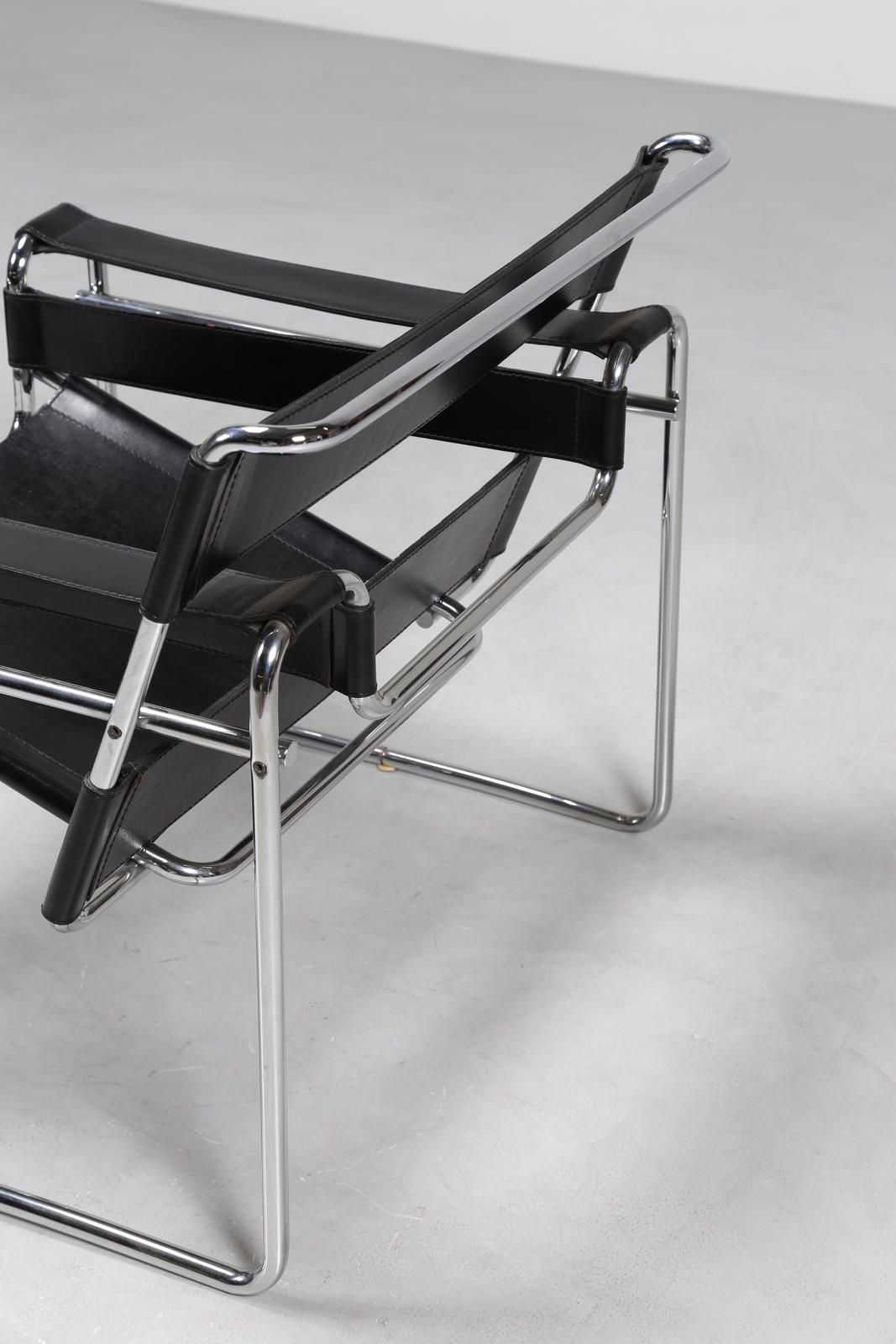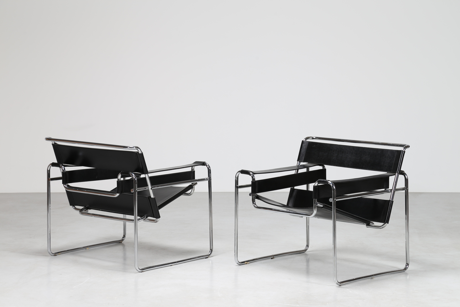 BREUER MARCEL LAJOS (1902 - 1981) Pair of armchairs with chromed steel tubular structure and hide seatback, mod. Wassily, for Gavina, 60’s. There is the signature.