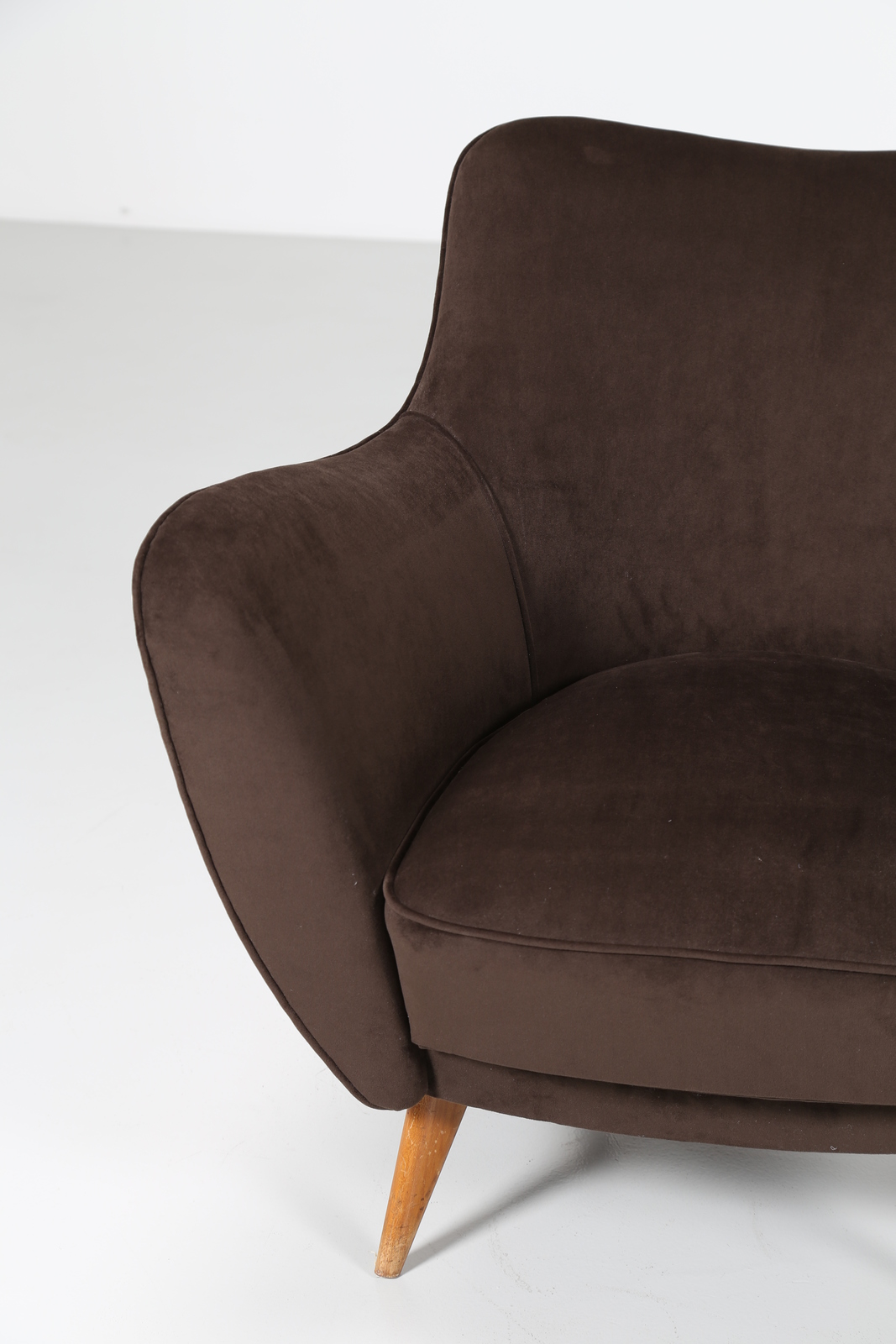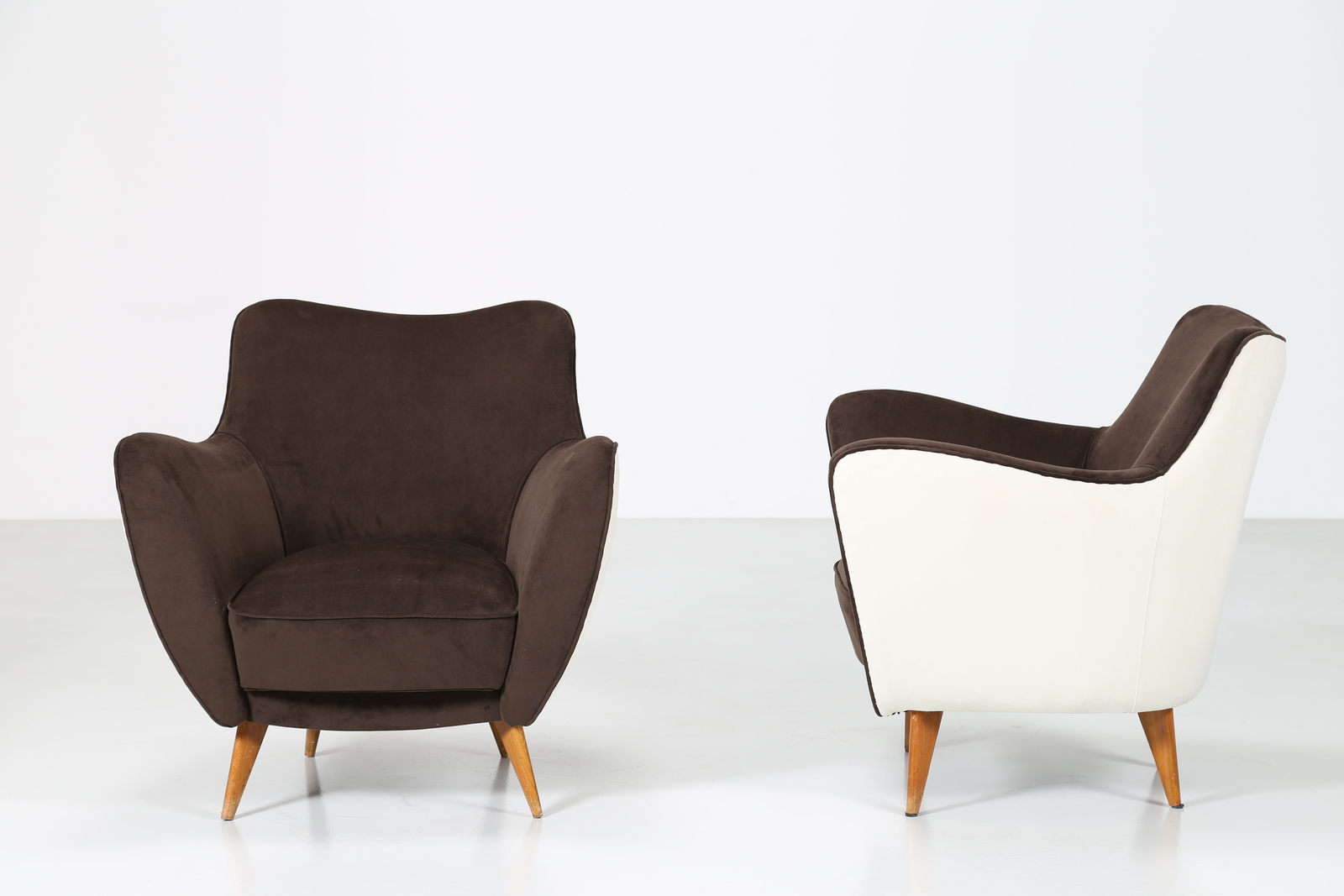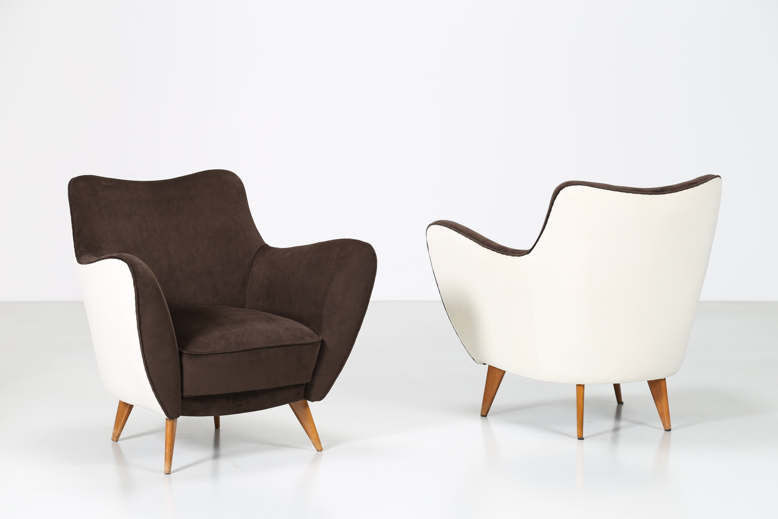 VERONESI GUGLIELMO Pair of armchairs with wood structure and two-coloured velvet covering, mod. Perla, Isa production, 50’s. Literature; Domus num. 247 semptember 1952 pag. 4.