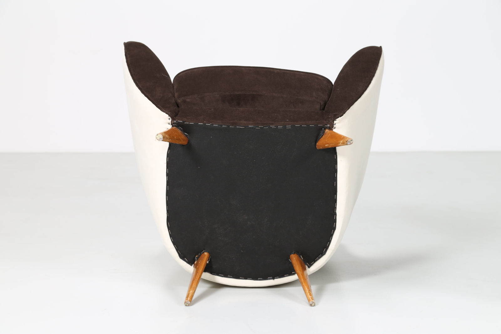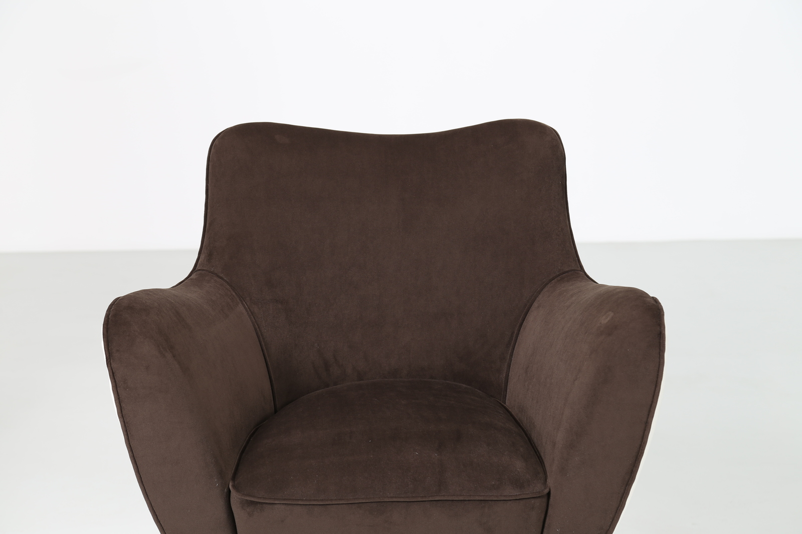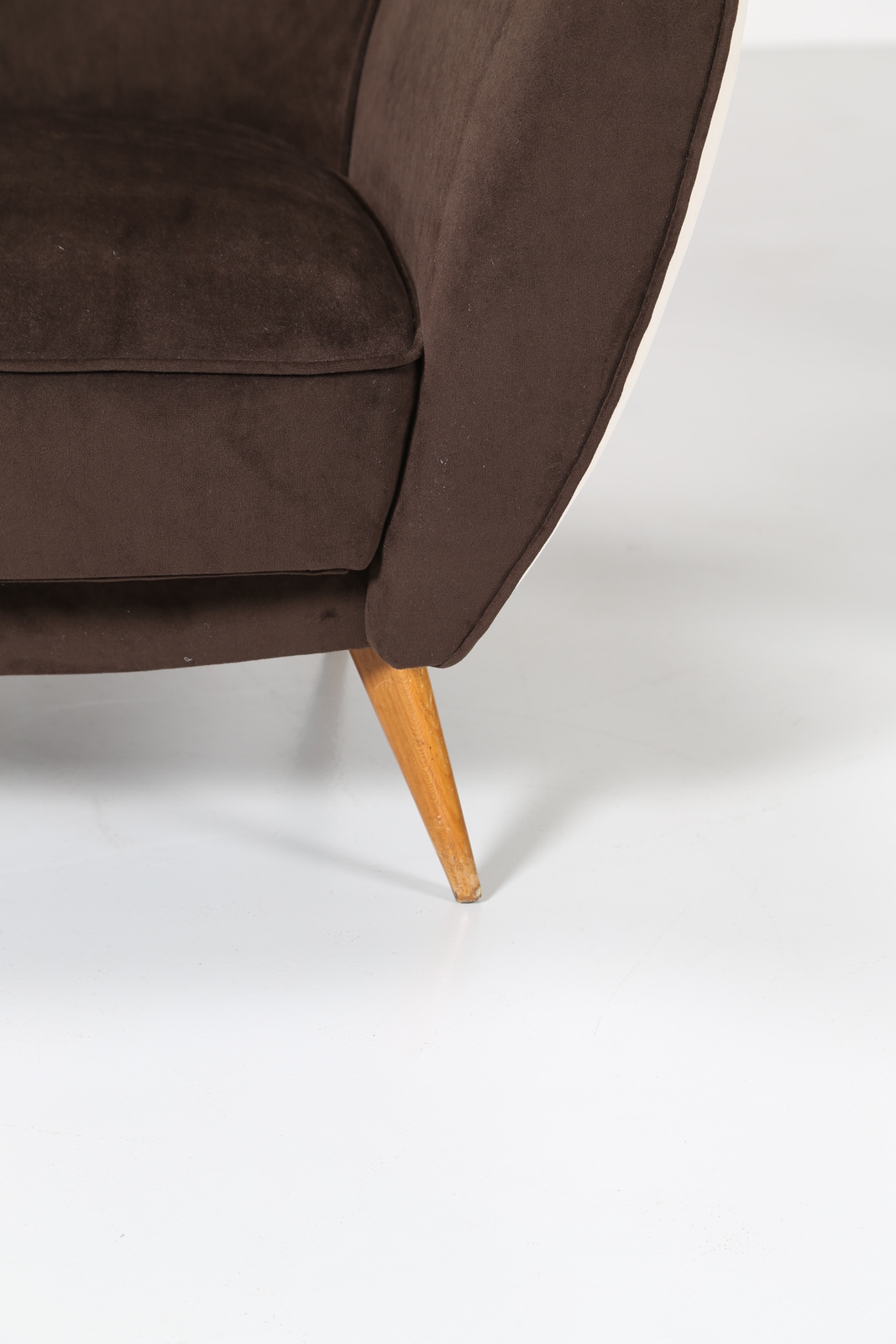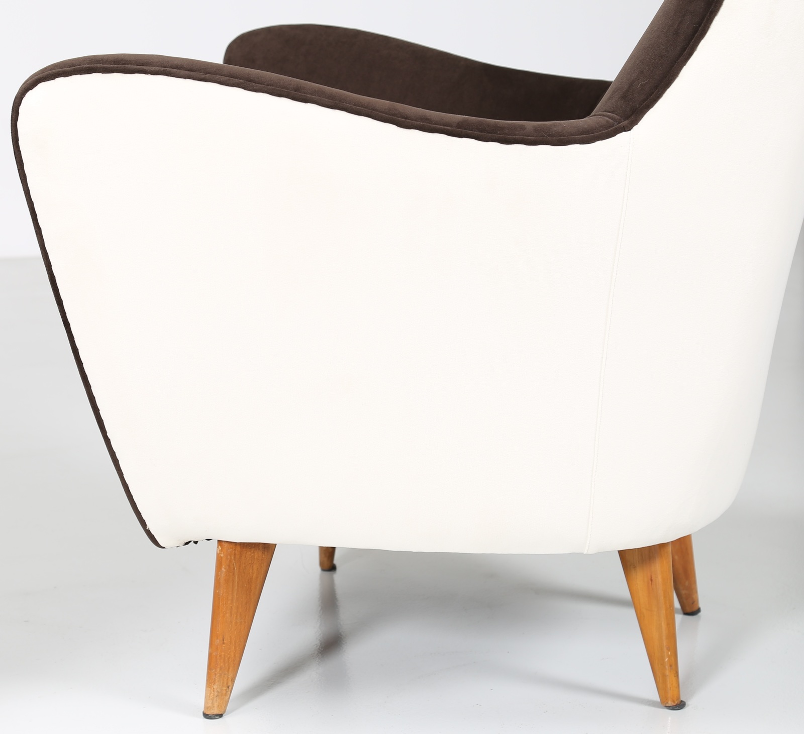 VERONESI GUGLIELMO Pair of armchairs with wood structure and two-coloured velvet covering, mod. Perla, Isa production, 50’s. Literature; Domus num. 247 semptember 1952 pag. 4.