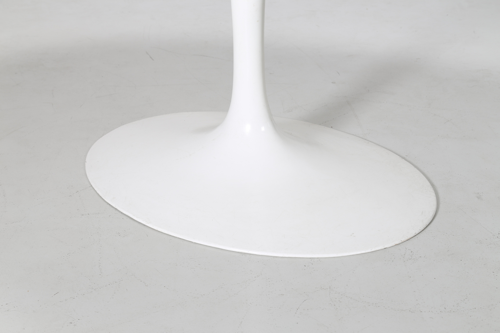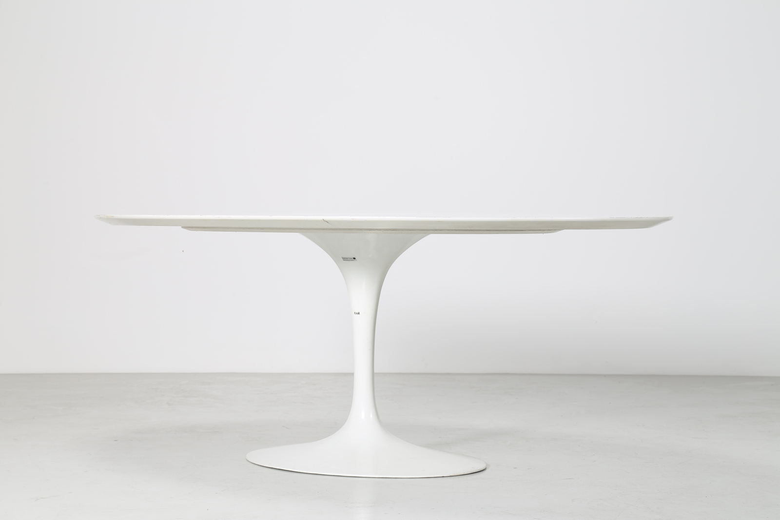 SAARINEN EERO Lacquered aluminum and wood oval table. Fiberglass oval table with melted aluminum base, lacquered wood level, mod. Tulip, for Knoll Internation, 70’s. There is the original label. Literature; Original bibliography Knoll catalog; Domus num. 337 december 1957 pag. 48/49.