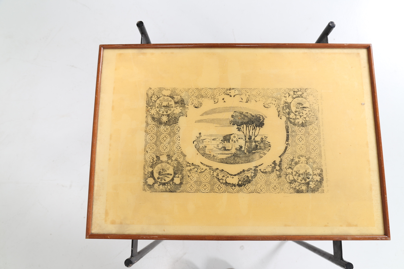 MANIFATTURA ITALIANA Tavolino in legno e metallo con piano in vetro e incisioni, anni 50. -. Cm 57,50 x 46,00 x 50,00.