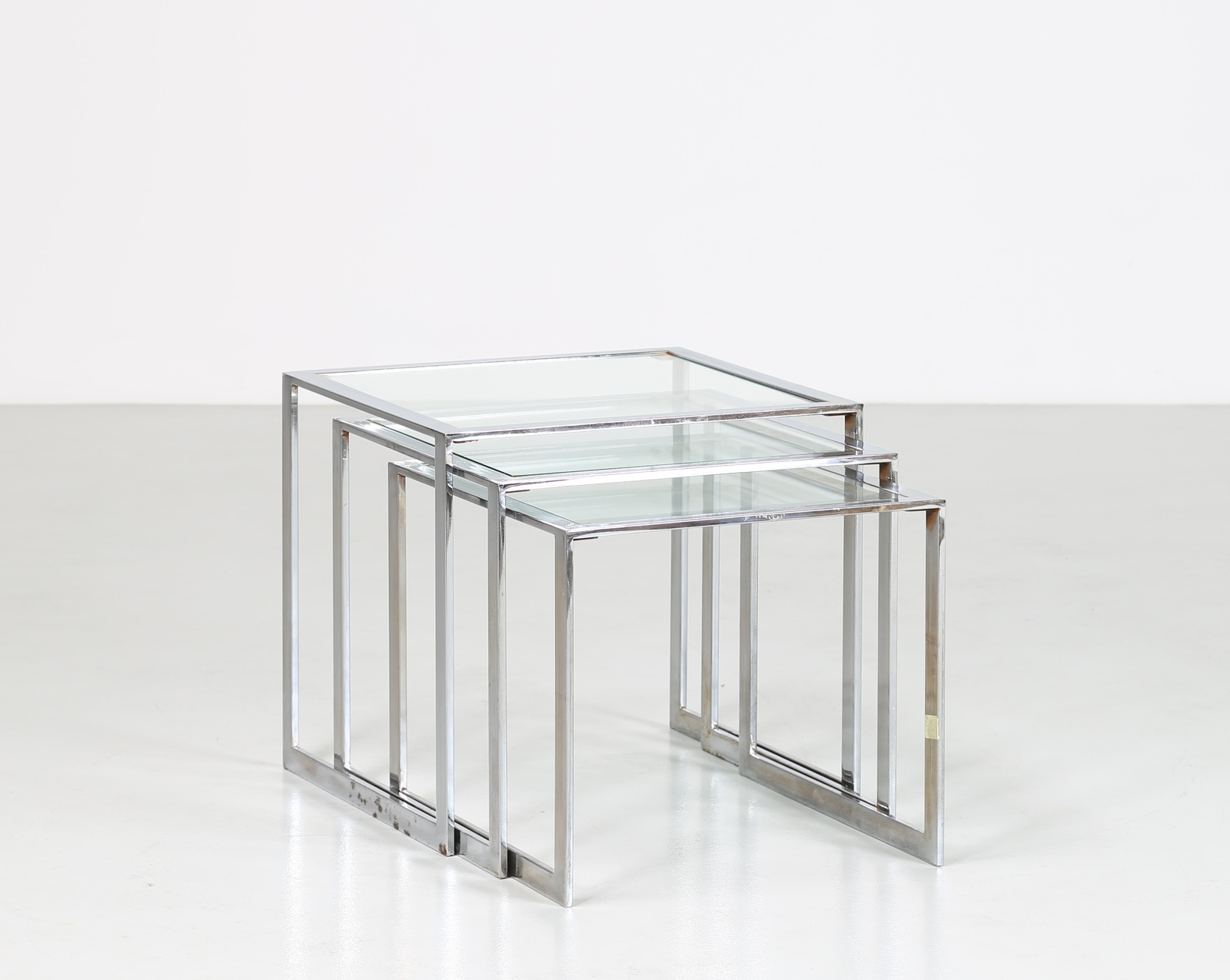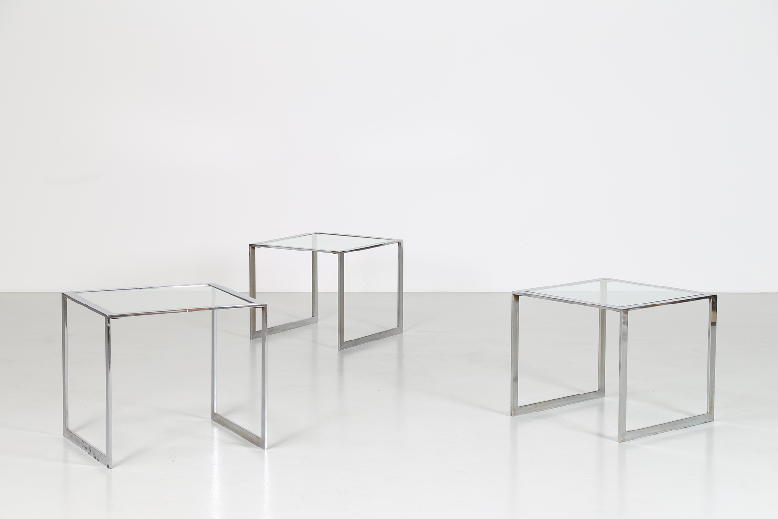 MANIFATTURA ITALIANA Tavolini impilabili in metallo cromato e vetro, . -. Cm...