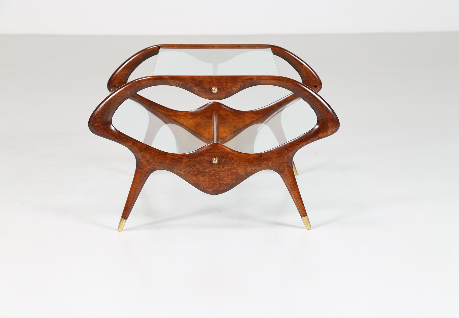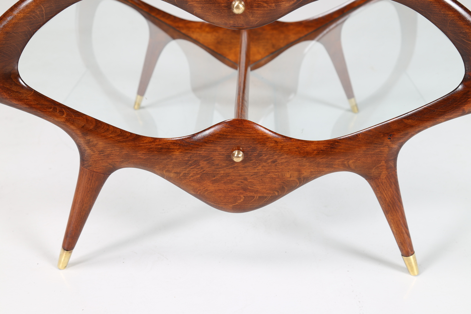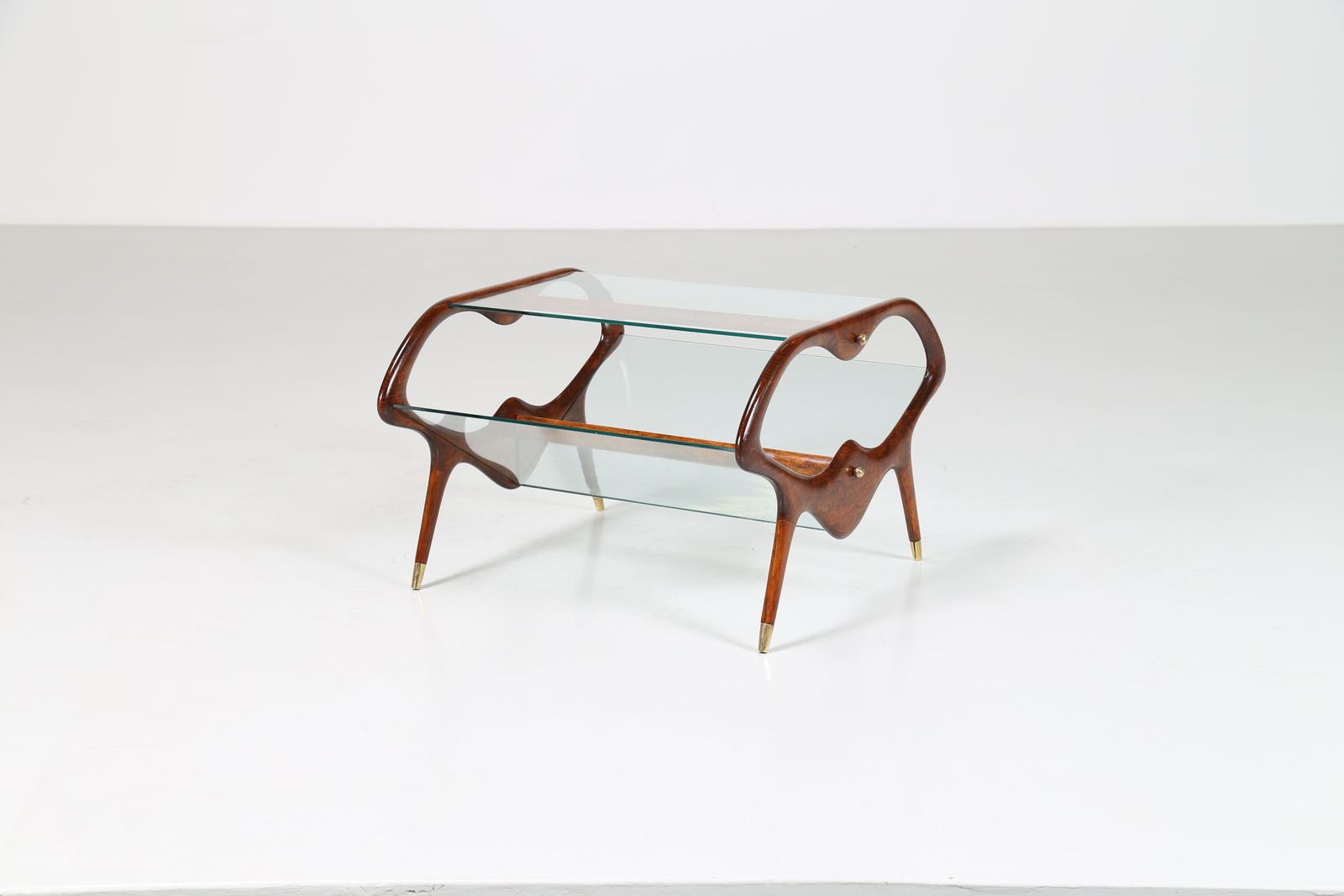 LACCA CESARE Tavolino portariviste in faggio con puntali e dettagli in ottone con piano in cristallo, anni 50. -. Cm 57,00 x 41,00 x 64,00.