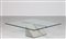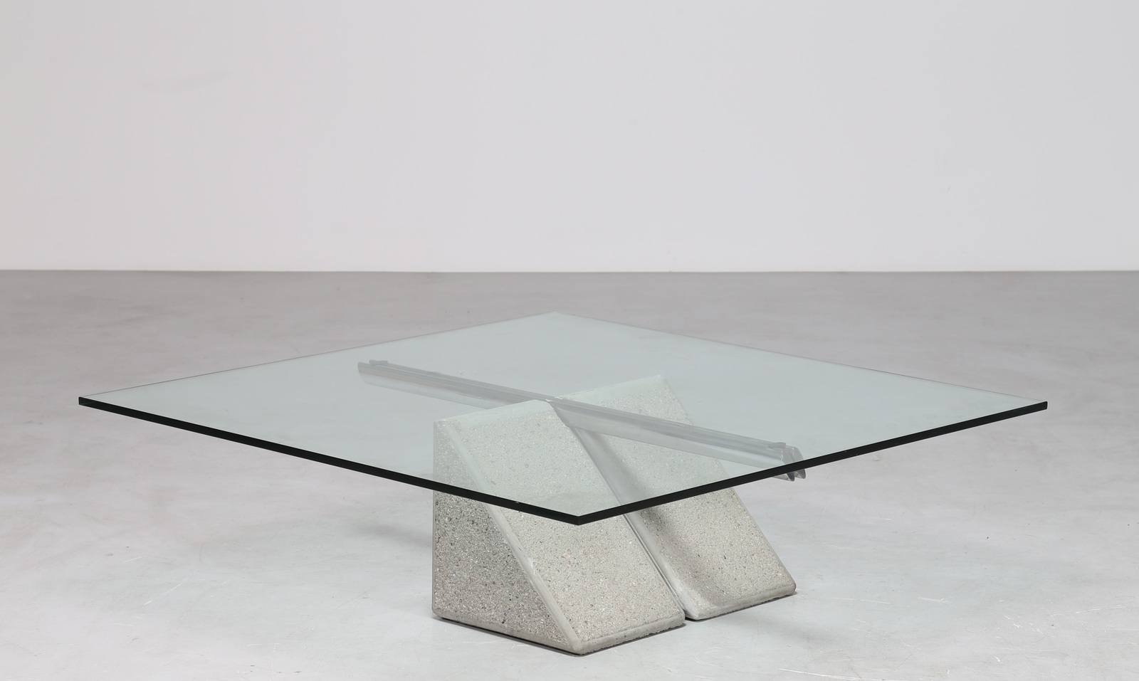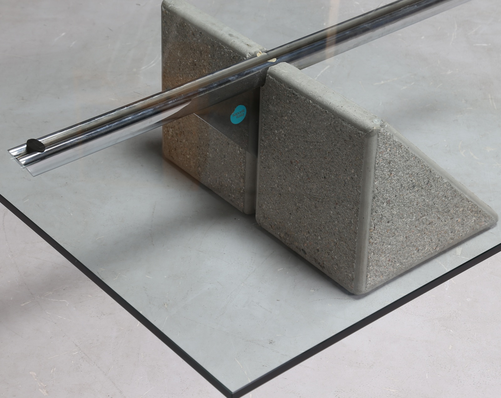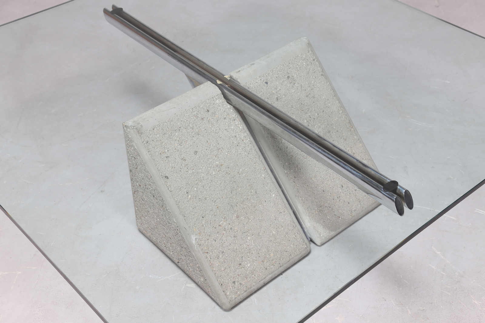 OFFREDI GIOVANNI (n. 1927) Tavolino da caffè con base in cemento e acciaio cromato, piano in cristallo, per Saporiti, anni 70. . Cm 119,50 x 35,50 x 119,50. Piano vetro scheggiato