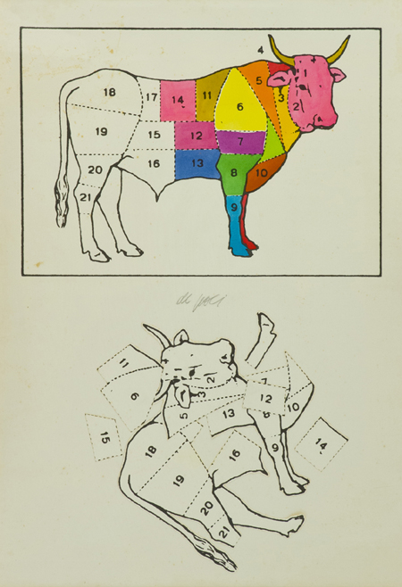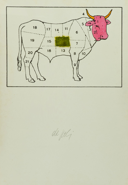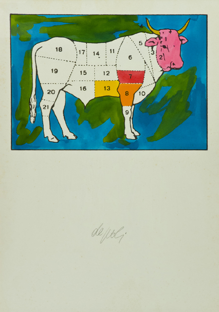 Fabio De Poli Genova 1947 Lotto unico di tre Opere - "Mucca", Tecnica mista su cartoncino, cm. 100x70, firmato in basso al centro; - "Mucca", Tecnica mista su cartoncino, cm. 100x70, firmato al centro; - "Mucca", Tecnica mista su cartoncino, cm. 100x70, firmato in basso al centro. Autentica dell'Artista su foto.
