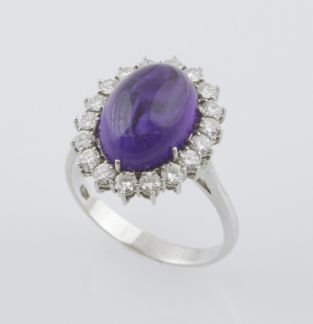 Anello in oro bianco a margherita centrato da ametista ovale taglio cabochon, con corona di 18 diamanti taglio briallnte per ca ct 1,60