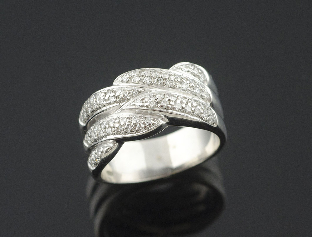 Anello in oro bianco a fascia con sommità di diamanti taglio a brillante su foglioline per ca ct 0,40