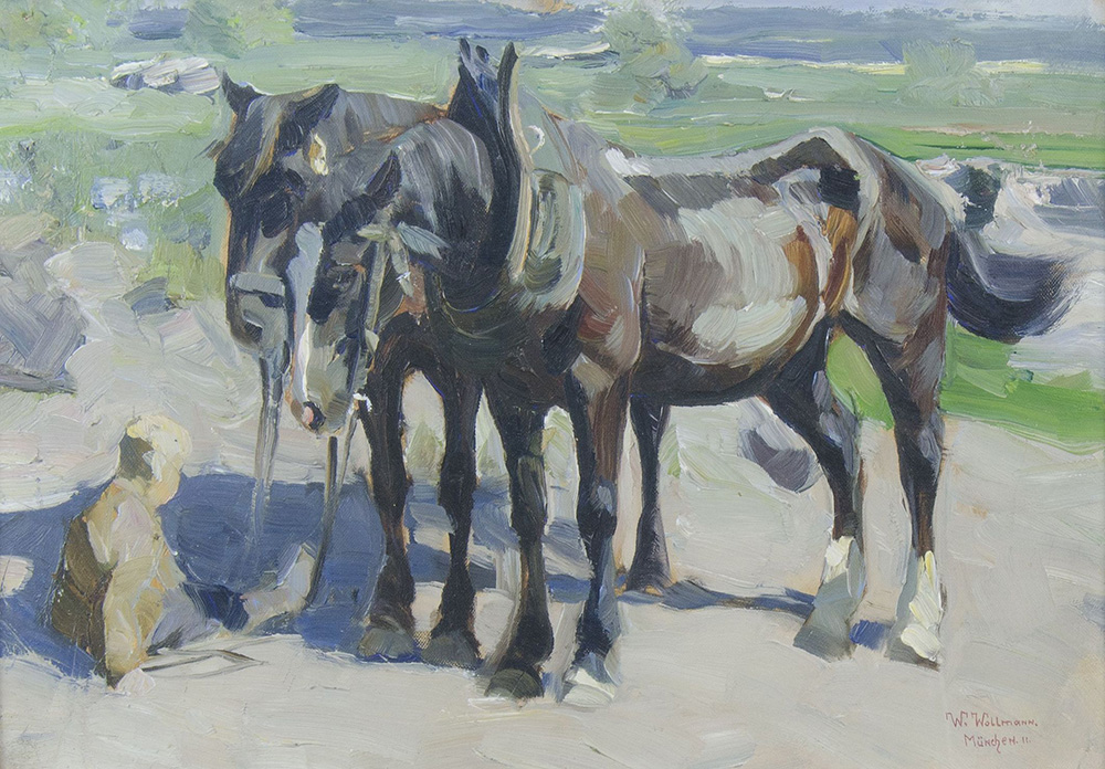 Wilhelm Wollmann 1872-1931 "Cavalli in riposo" cm. 35x50 - olio su cartone Firmato b. a d. e datato Munich '11.