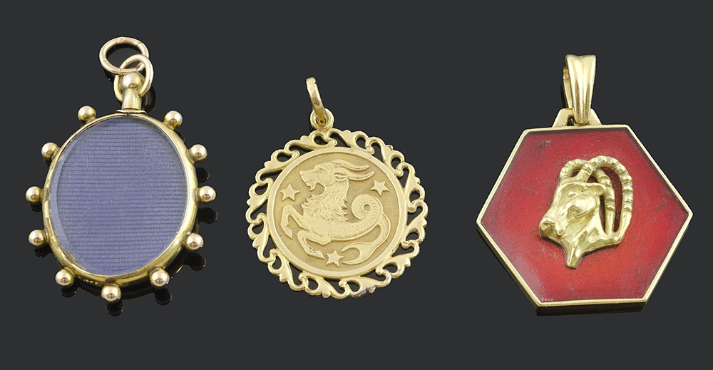Lotto composto da 2 medaglie in oro giallo , di cui una con smalti e ciondolo portafoto, gr tot. 25