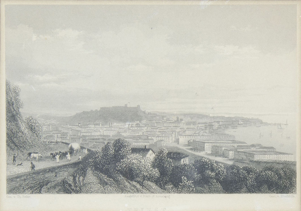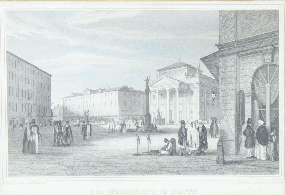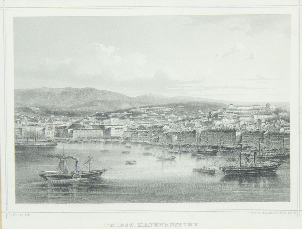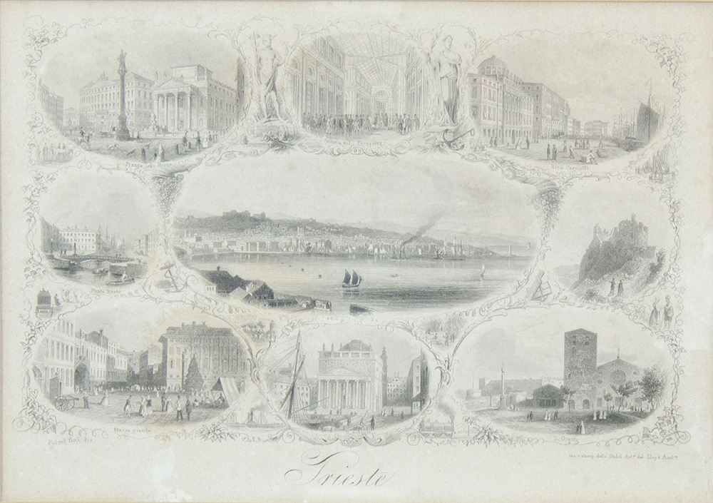 Lotto di 8 piccole stampe raffguranti Trieste, tutte incorniciate.