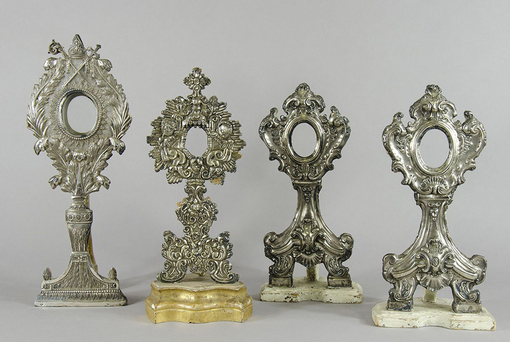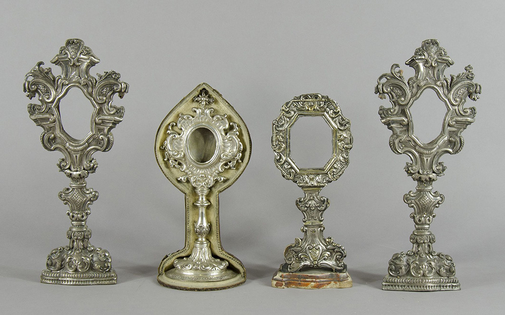 Lotto di 8 reliquiari in argento lavorati a sbalzo, punzonati Napoli, Stato Pontificio e Regno di Sardegna. Inizio XIX secolo. H. max cm. 44.