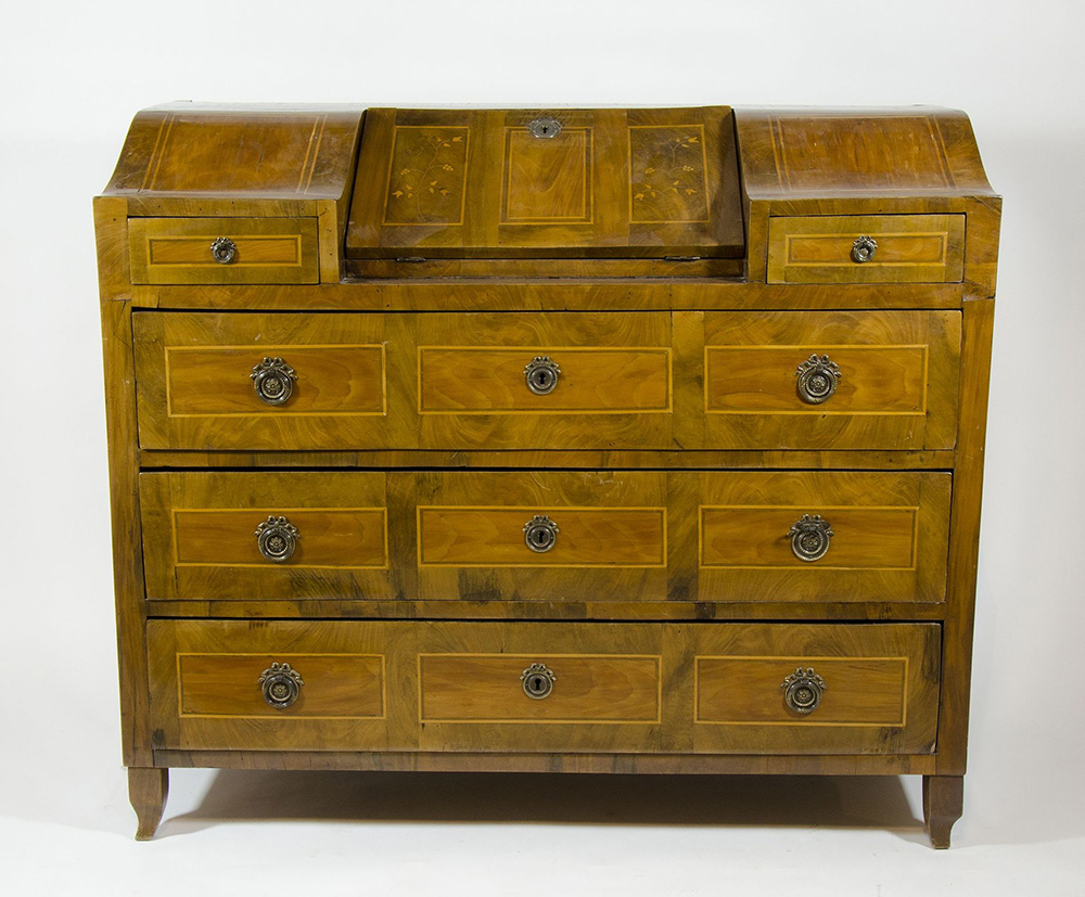 Cassettone a 3 cassetti e calatoia con ai fianchi 2 cassetti, intarsi in legni chiari a filettature e motivi floreali. XIX secolo. cm. 110x128x56.