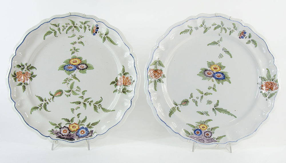 Lot 325 | Coppia di grandi piatti in maiolica a smalti policromi con decori floreali....