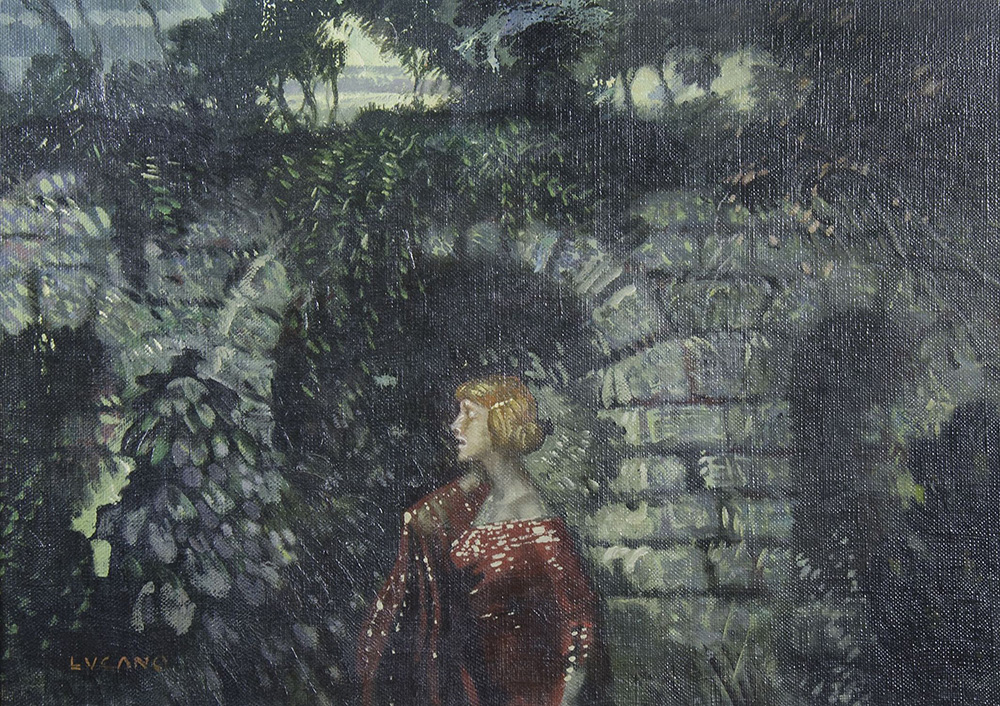 Pietro Lucano Trieste 1878-1972 "Bozzetto per La Pazza" cm. 45x65 - olio su faesite Firmato b. a s. Al retro numero 109 con firma e titolo.