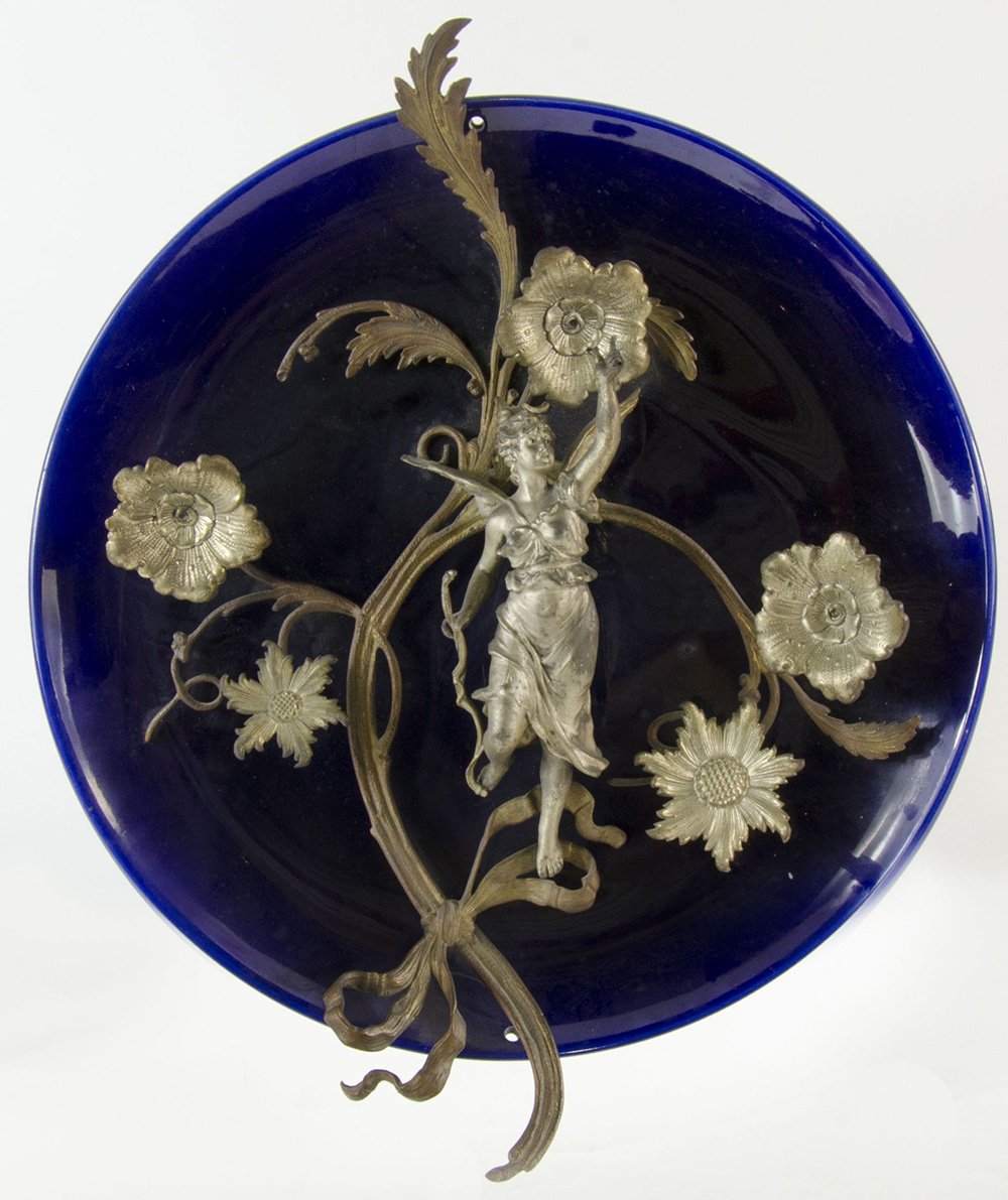 Grande piatto in porcellana con applicazione in metallo di donna alata. Diam. cm. 41.