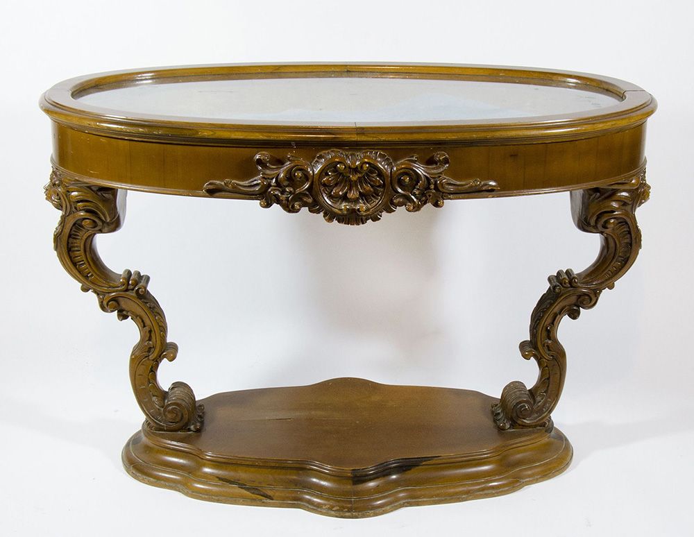 Lot 358 | Tavolo-vetrina di forma ovale in legno su gambe scolpite con mascheroni,...