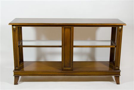 Libreria in legno con ripiani centrali in vetro, ai lati colonnette. Lung. cm. 135.
