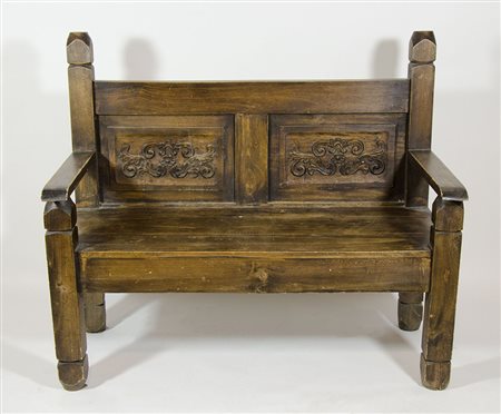 Panchetta a 2 posti in legno con schienale scolpito. Lung. cm. 116.