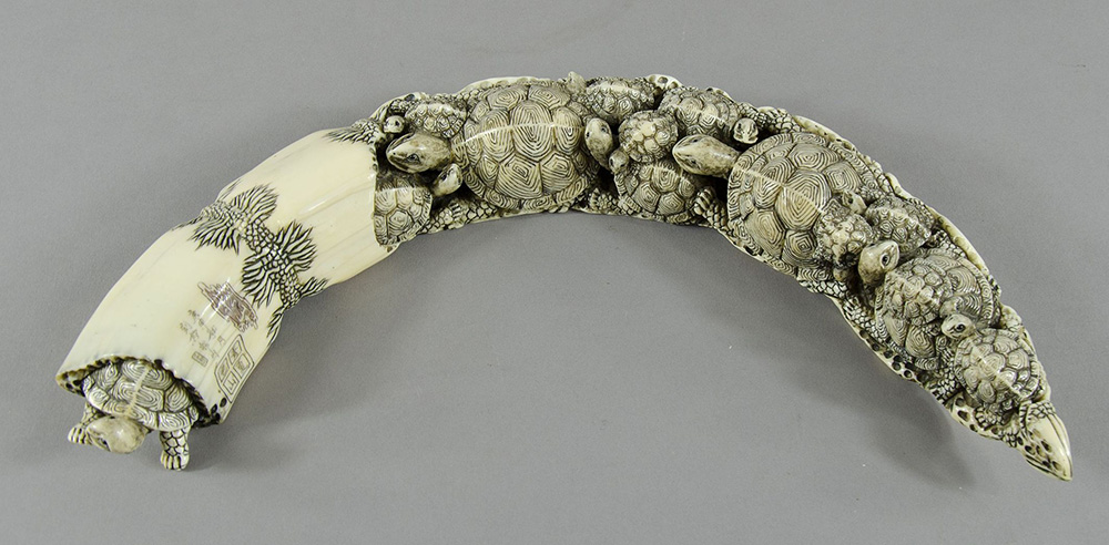 Zanna di facocero finemente intagliata raffigurante famiglia di tartarughe. Firmata. Lung. cm. 37.