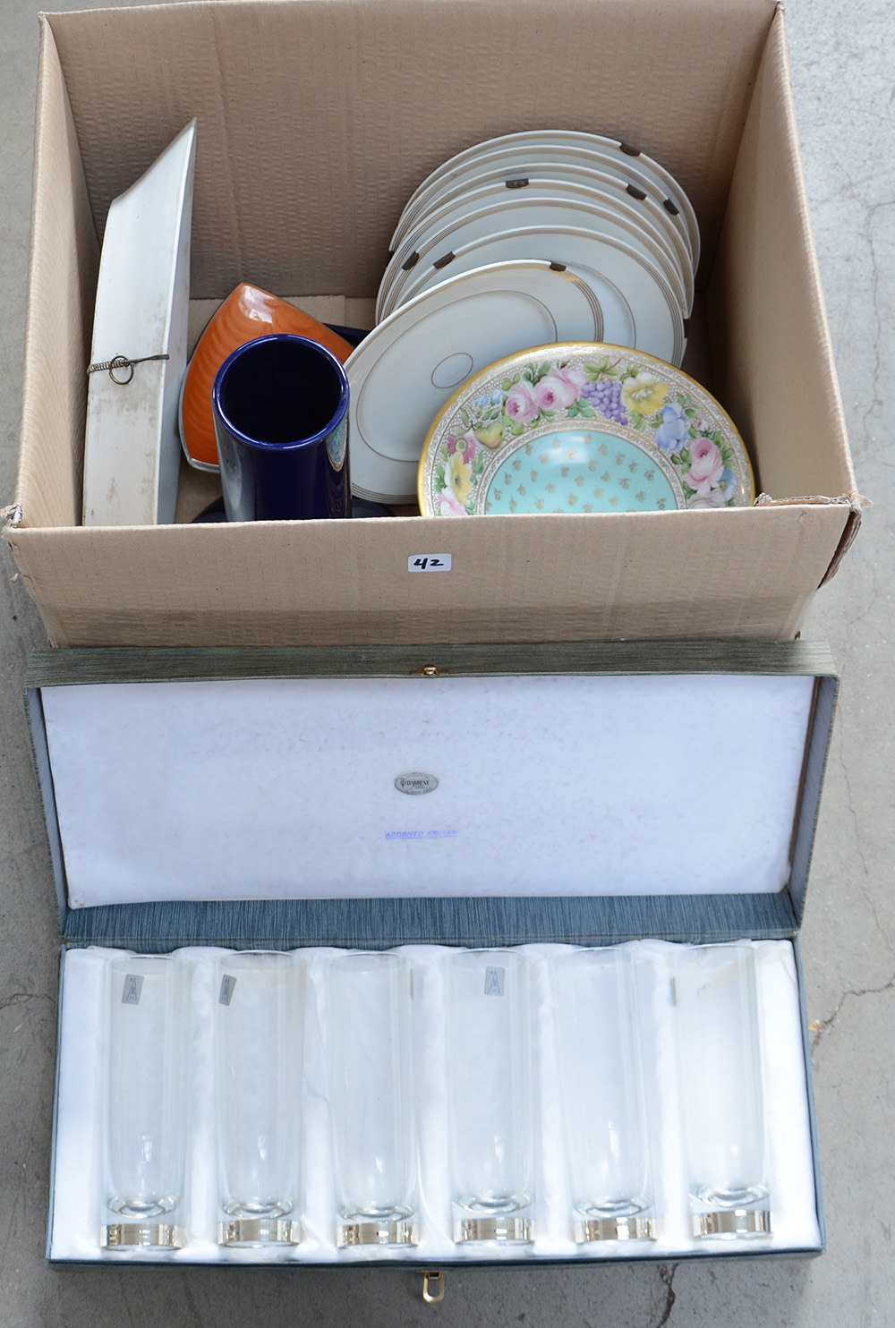 Lotto composto da un cartone contenente alcuni oggetti per la tavola e una confezione di sei bicchieri di cristallo con guarnizioni in metallo argentato (difetti)