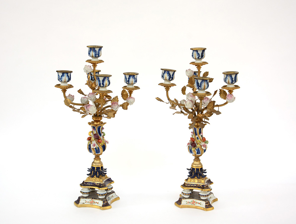 Manifattura francese, coppia di candelieri a cinque fiamme con base in porcellana policroma e braccia a forma di rami di rosa (h cm 47) (lievi difetti)