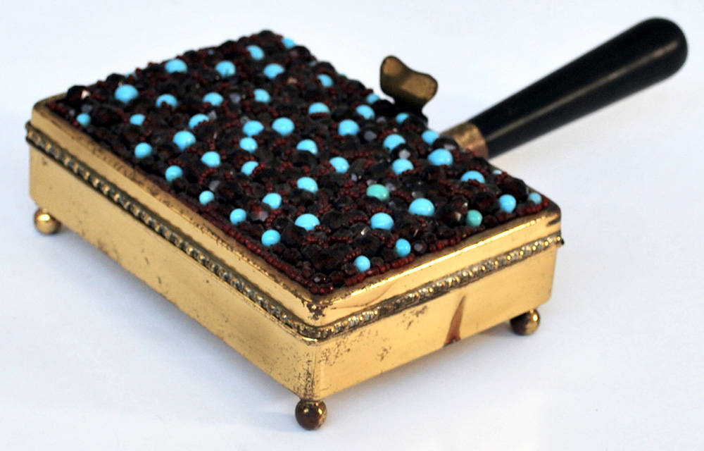 Scatoletta in metallo dorato decorata con perline e materiali diversi (difetti e mancanze)