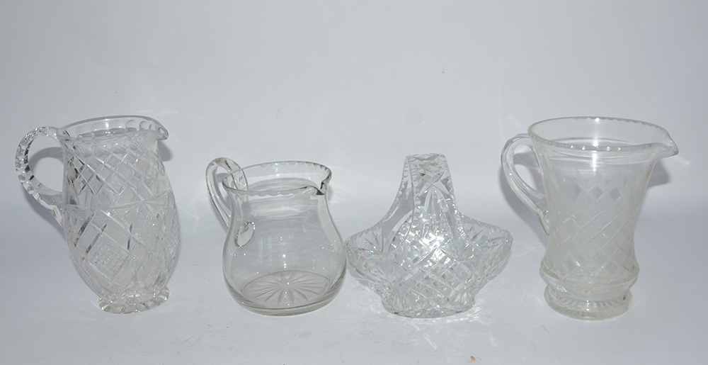 Lotto composto da tre brocche per l'acqua e un cestino in cristallo sfaccettato (lievi difetti)