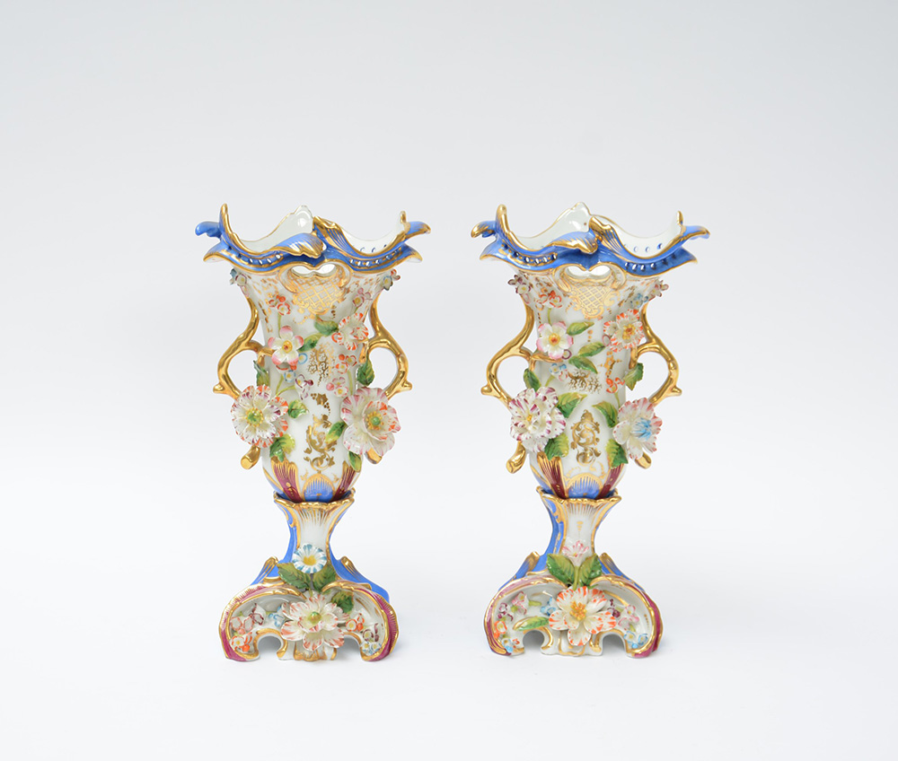 Manifattura francese del secolo XIX, coppia di vasetti in porcellana decorata in policromia ed in rilievo a fiori e uccelli (h cm 28)(lievi difetti)