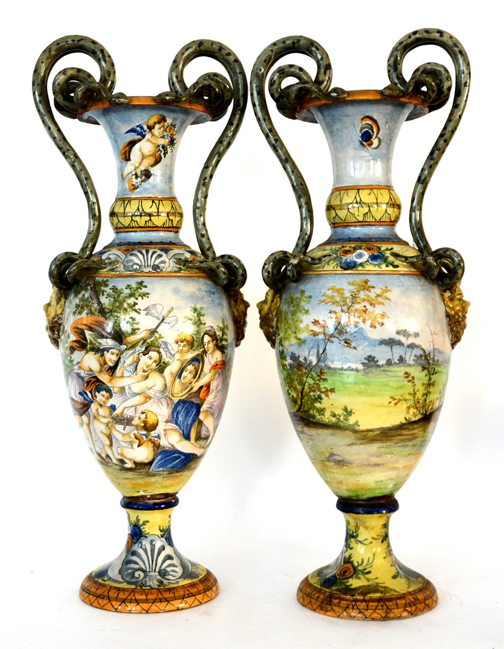 Manifattura Castelli, fine sec. XIX. Coppia di vasi biansati decorati in policromia a scene mitologiche, angeli e cherubini. Anse in rilievo, serpenti avviluppati decorati a mascheroni (h. cm 62) (difetti e restauri)