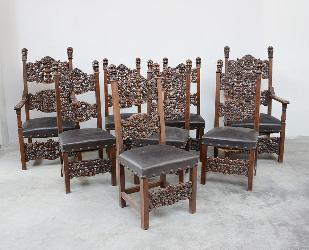 Gruppo di due poltrone e otto sedie in noce intagliate in stile rinascimentale a motivi vegetali, vasi con frutta, rosoni e mascheroni (difetti)