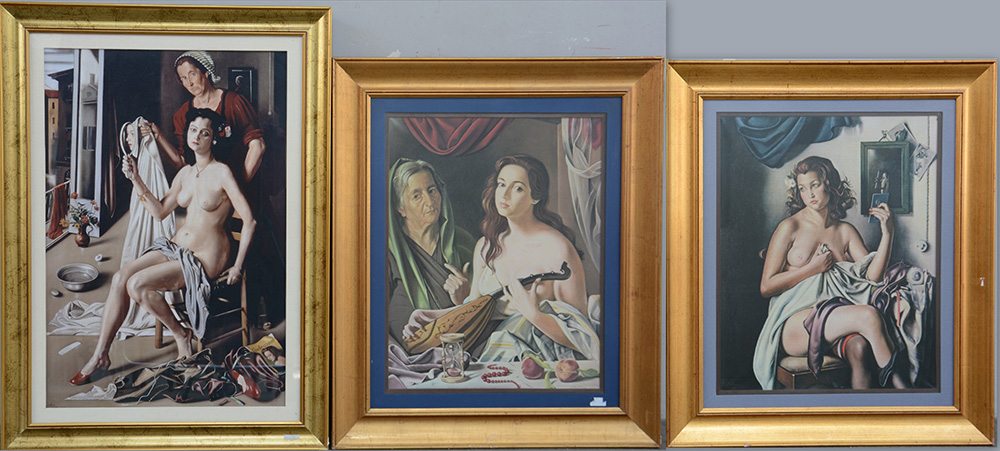 Lotto di tre multipli su tela da Gregorio Sciltian (misure diverse) in cornice, edizioni pregiate Trec SPA Roma, timbri al retro (difetti)