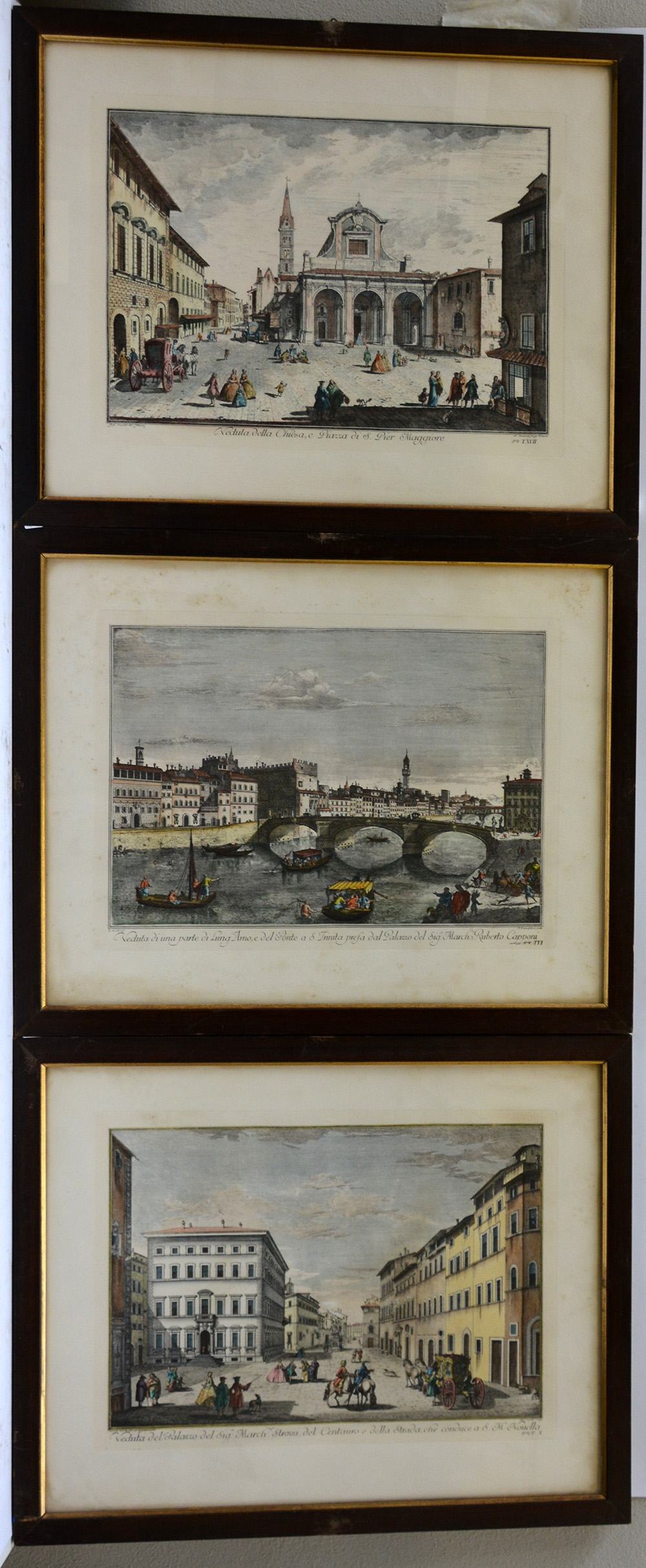 Giuseppe Zonchi ( 1711- 1767)Lotto di tre incisioni (308x410 mm) colorate all'epoca raffiguranti belle vedute della città di Firenze. In cornici (lievi difetti).