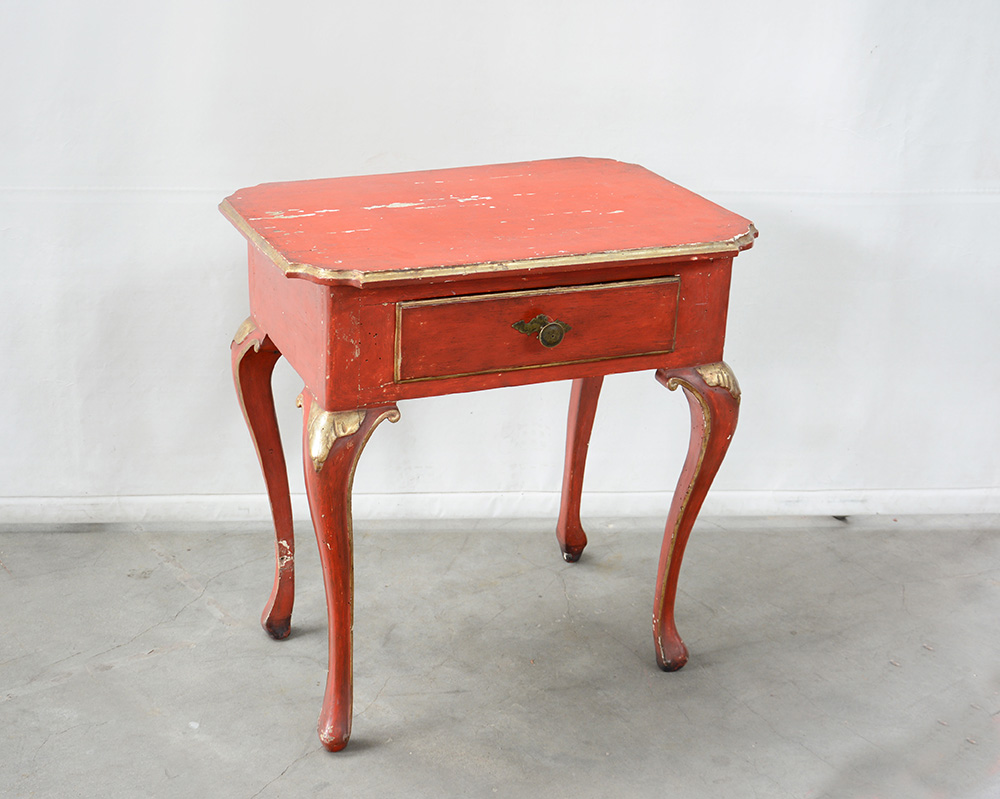 Tavolino da centro in legno laccato rosso con profili dorati, un cassetto nella fascia, gambe mosse, sec XVIII (cm 68x72x49) (difetti e restauri)