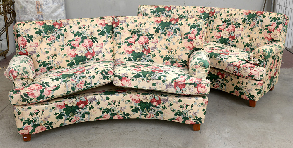 Coppia di divani a forma curva a tre posti rivestiti con tessuti a fiori