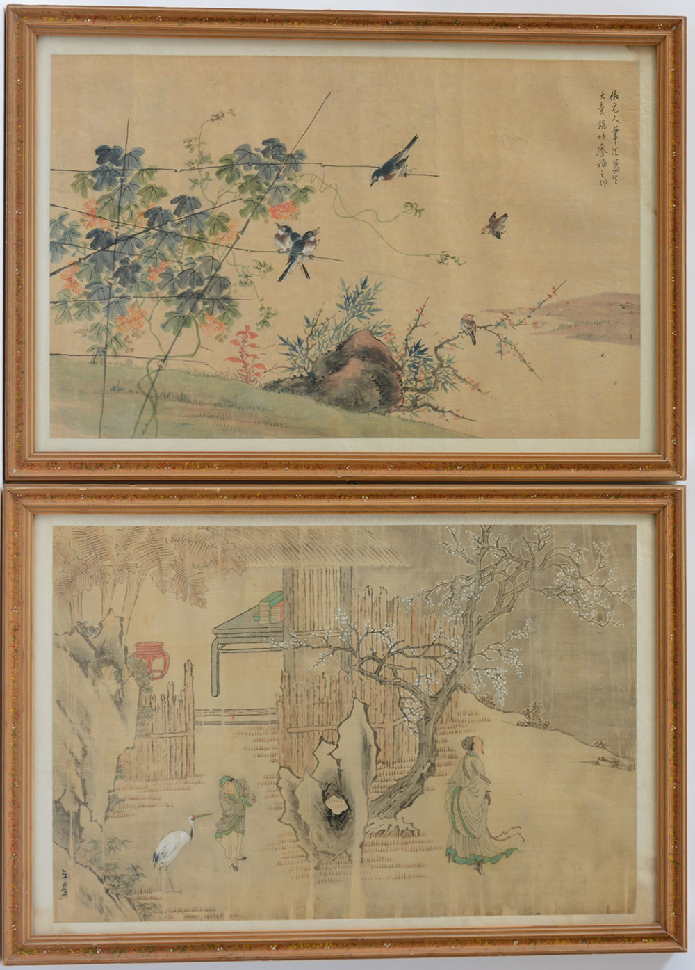 Lotto composto da due dipinti ad inchiostro e colore su seta, uno dei quali con figure presso un padiglione l'altro con uccelli tra rami in fiore, con calligrafia, in cornice Cina, fine sec. XIX (cm 50x34 e cm 51x33)
