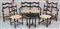 Fornitura da salotto in legno tinto con gambe tornite, braccioli e schienali a giorno mossi, seduta in corda di paglia intrecciata, composto da un divano a due posti, due poltrone e due sedie e un tavolino. Fine sec. XIX (difetti)
