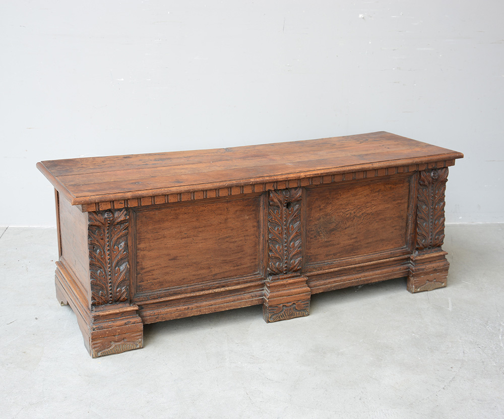 Cassone in noce con fronte bipartito e decorato con foglie di acanto, piedi a mensola (cm 162x58x55) (difetti e restauri)