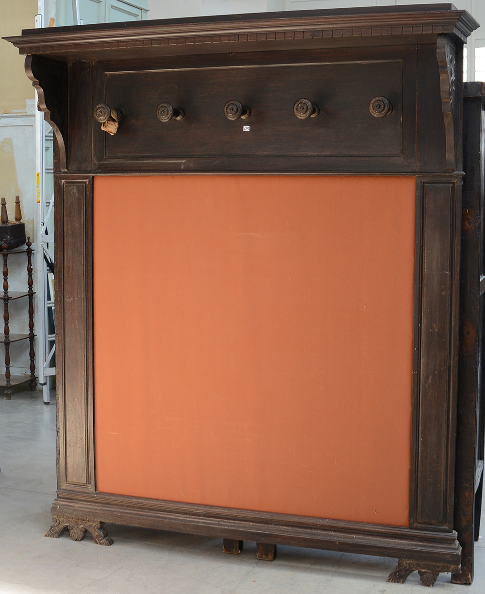 Attaccapanni a cinque grucce con struttura in legno intagliato e pannello foderato, inizio sec XX (cm 170x202x34)(difetti)