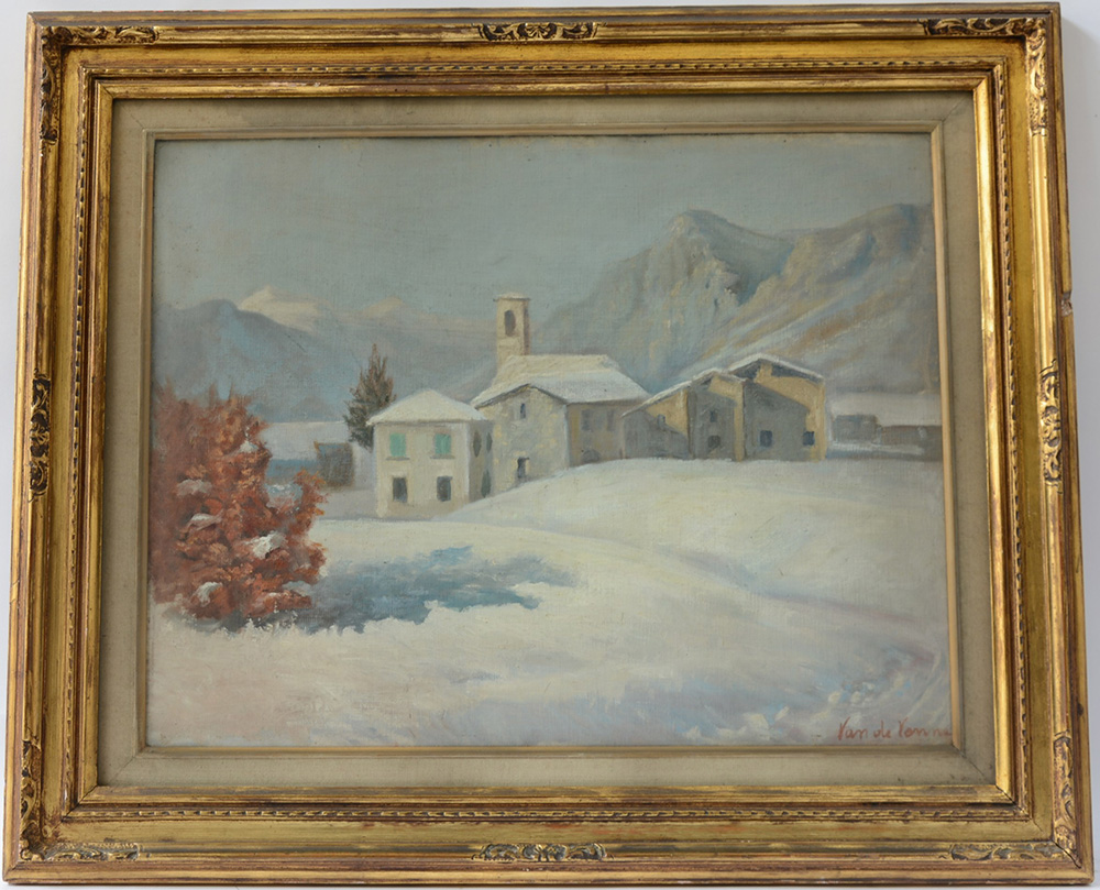 Ignoto "Paesaggio innevato" olio su cartone telato (cm 48x63) reca firma Van De Venne in basso a destra, in cornice (difetti)
