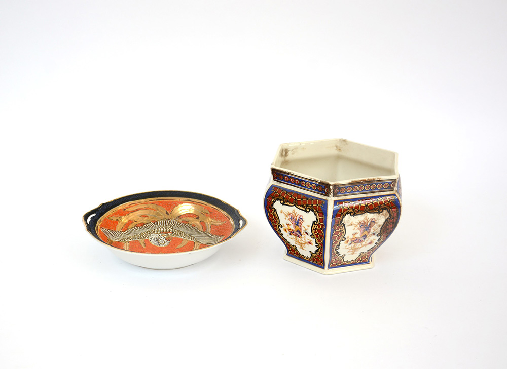 Lotto composto da un piatto a rilievo e dorature e un cachepot esagonale (difetti) Giappone, secolo XX (diam. max 21 cm; h. max 14 cm.)