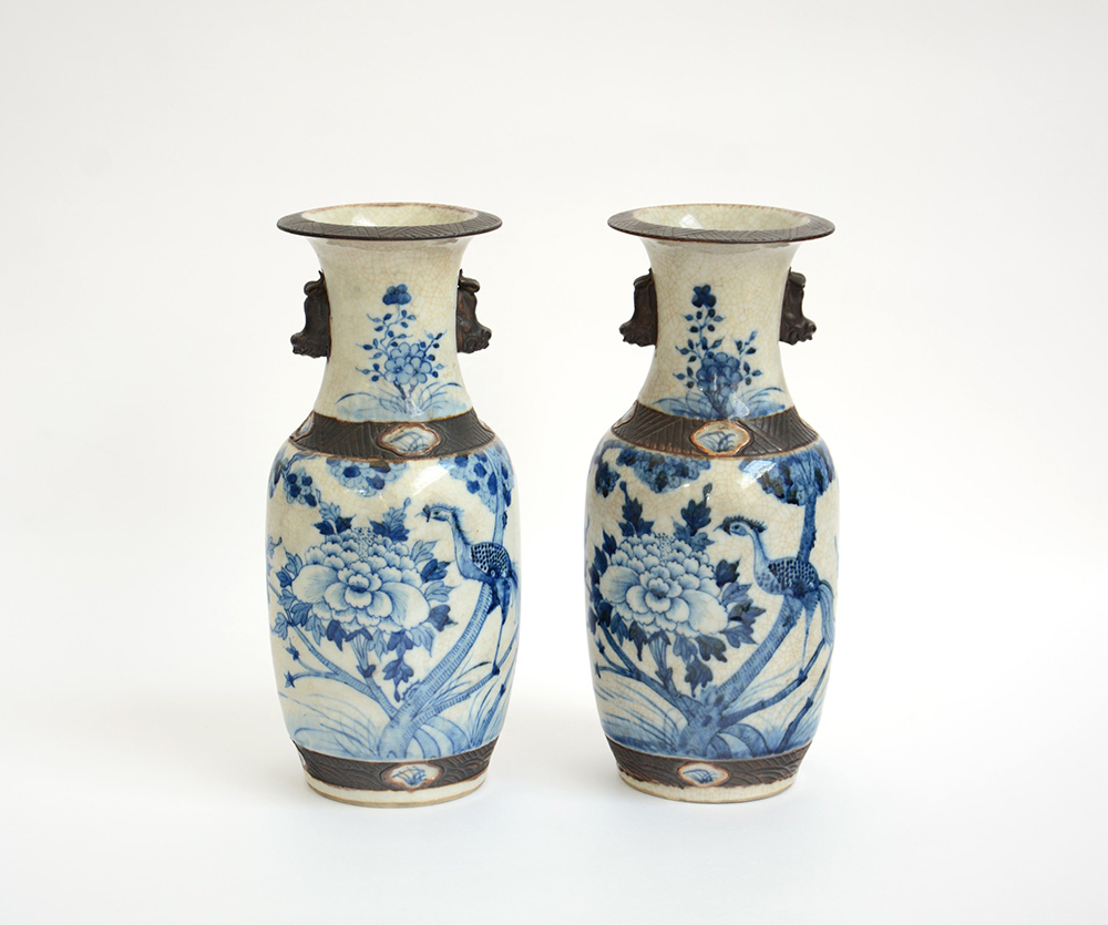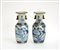 Coppia di vasi in porcellana bianca e blu decorata con motivi floreali e...