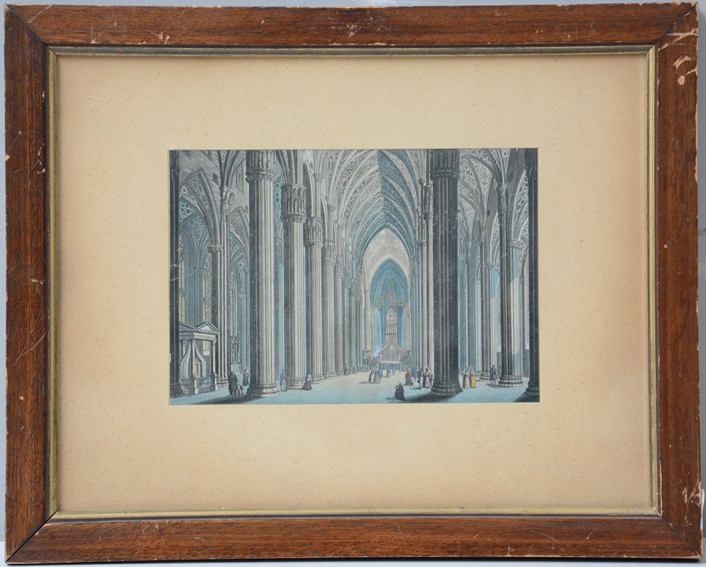 Incisione a colori del sec. XIX raffigurante interno di cattedrale (cm 14x20) (difetti)