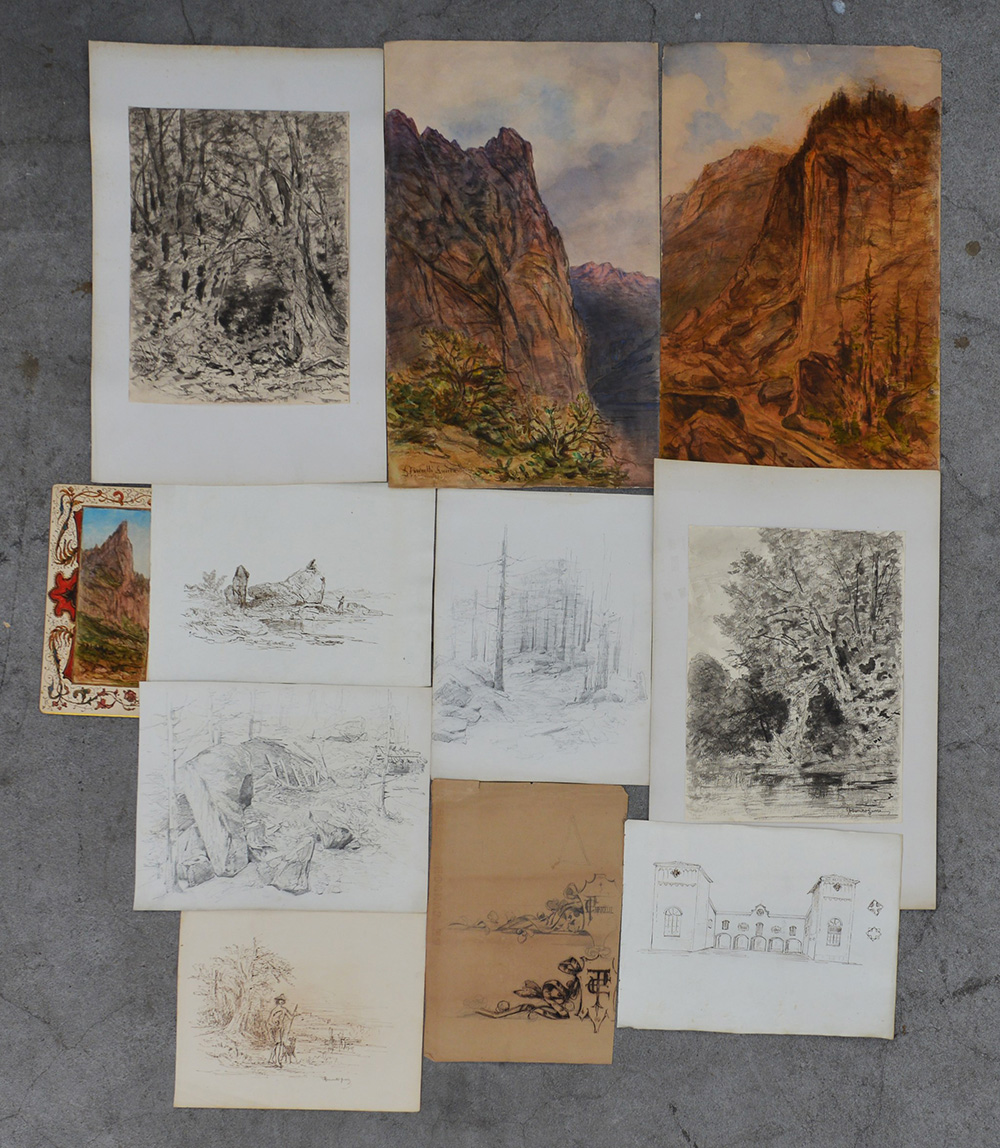 Giuseppe Puricelli Guerra (Gallarate 1832-Casirate D'Adda 1894)Cartelletta contenente undici tra disegni, bozzetti, incisioni ed acquarelli per lo più raffiguranti paesaggi, molti firmati (difetti)
