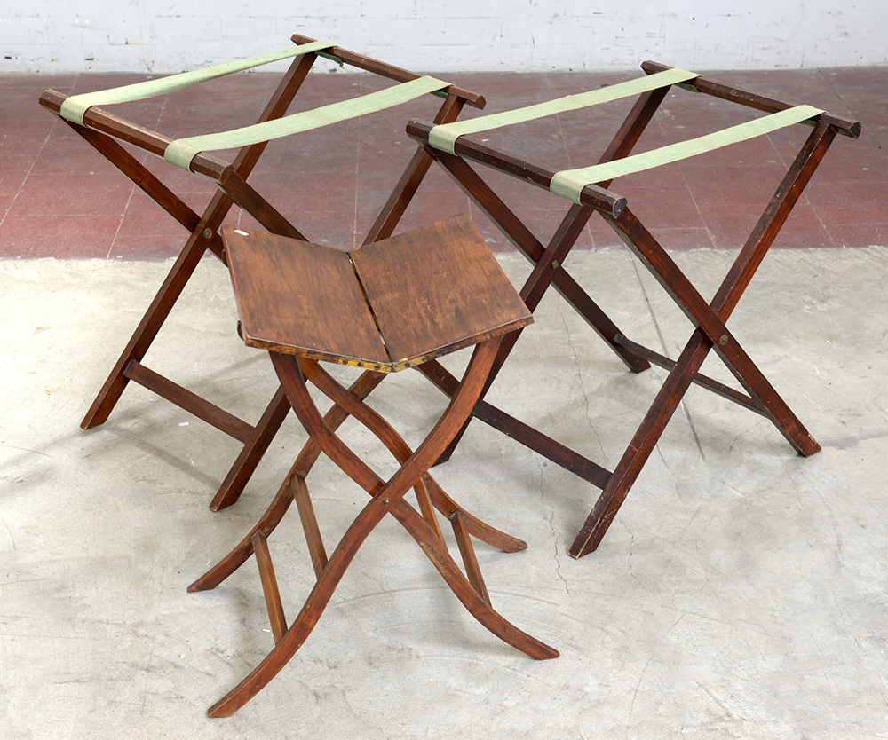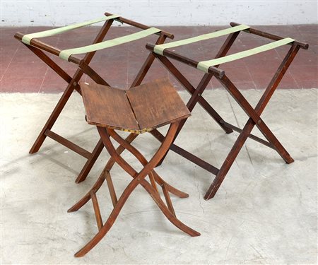 Lotto composto da un tavolino pieghevole e due trespoli porta valigie