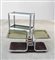 Lotto composto da un tavolino da salotto a due scomparti con divisorio porta bottiglie e un carrello porta televisore a due ripiani, entrambi con struttura tubolare in metallo cromato, piani in vetro e rotelle (difetti)
