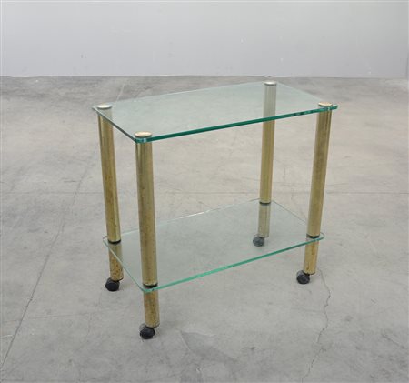Carrello porta televisore a due ripiani in cristallo con gambe tubolari in metallo ottonato munite di rotelle (cm 74x74x40) (difetti)