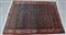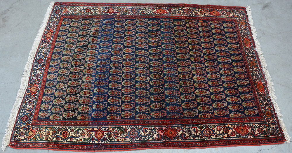 Tappeto Malayer, Persia sec XX. Campo decorato con file di Boteh in policromia su fondo blu, bordura con motivo Herati su fondo bianco (cm 158x115) (difetti e colature del colore rosso)